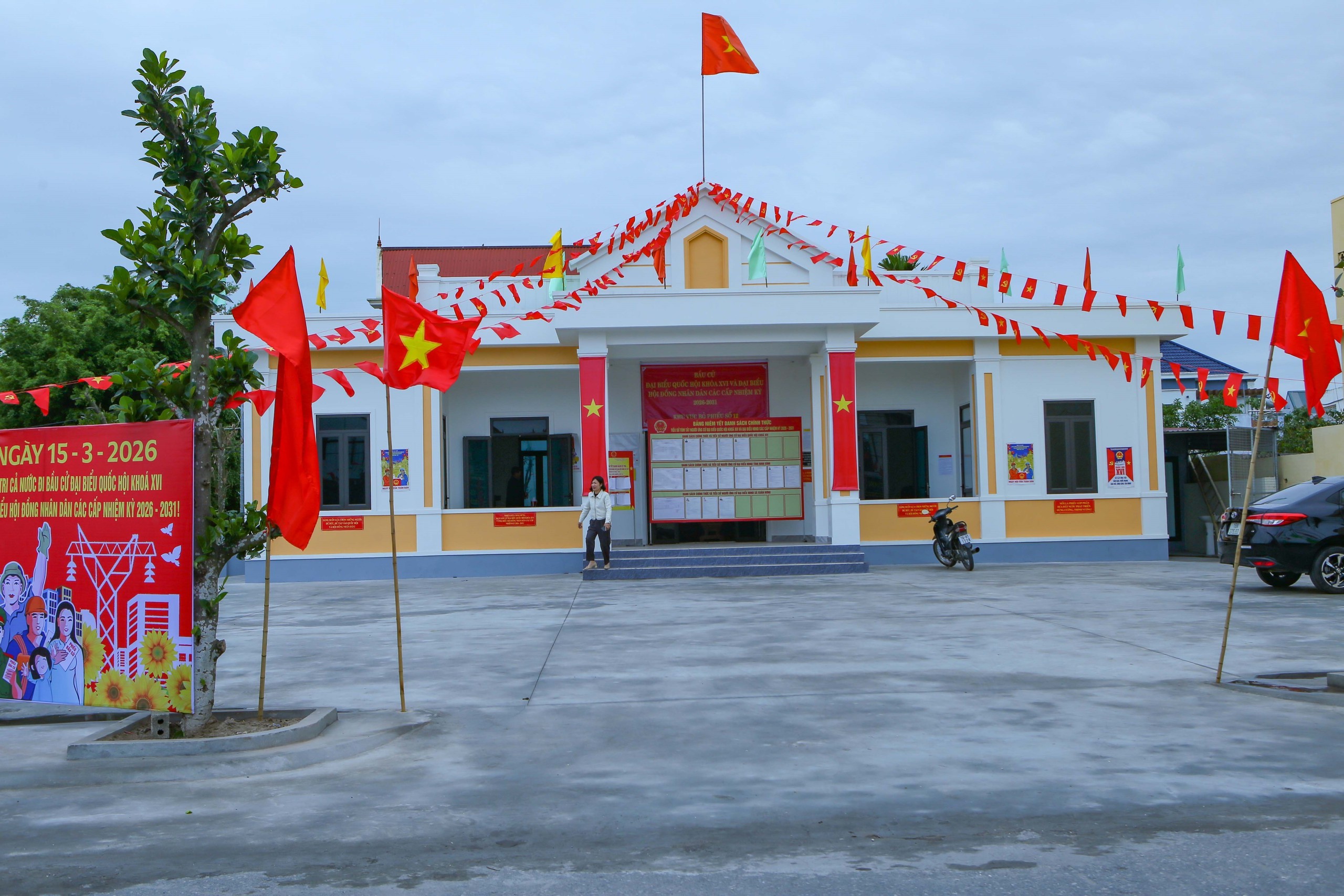 Khu vực bỏ phiếu số 12, xã Xuân Hưng, có khoảng 93% đồng bào Công giáo, được trang hoàng rực rỡ chào đón Ngày hội non sông. Ảnh: Công Luật - TTXVN