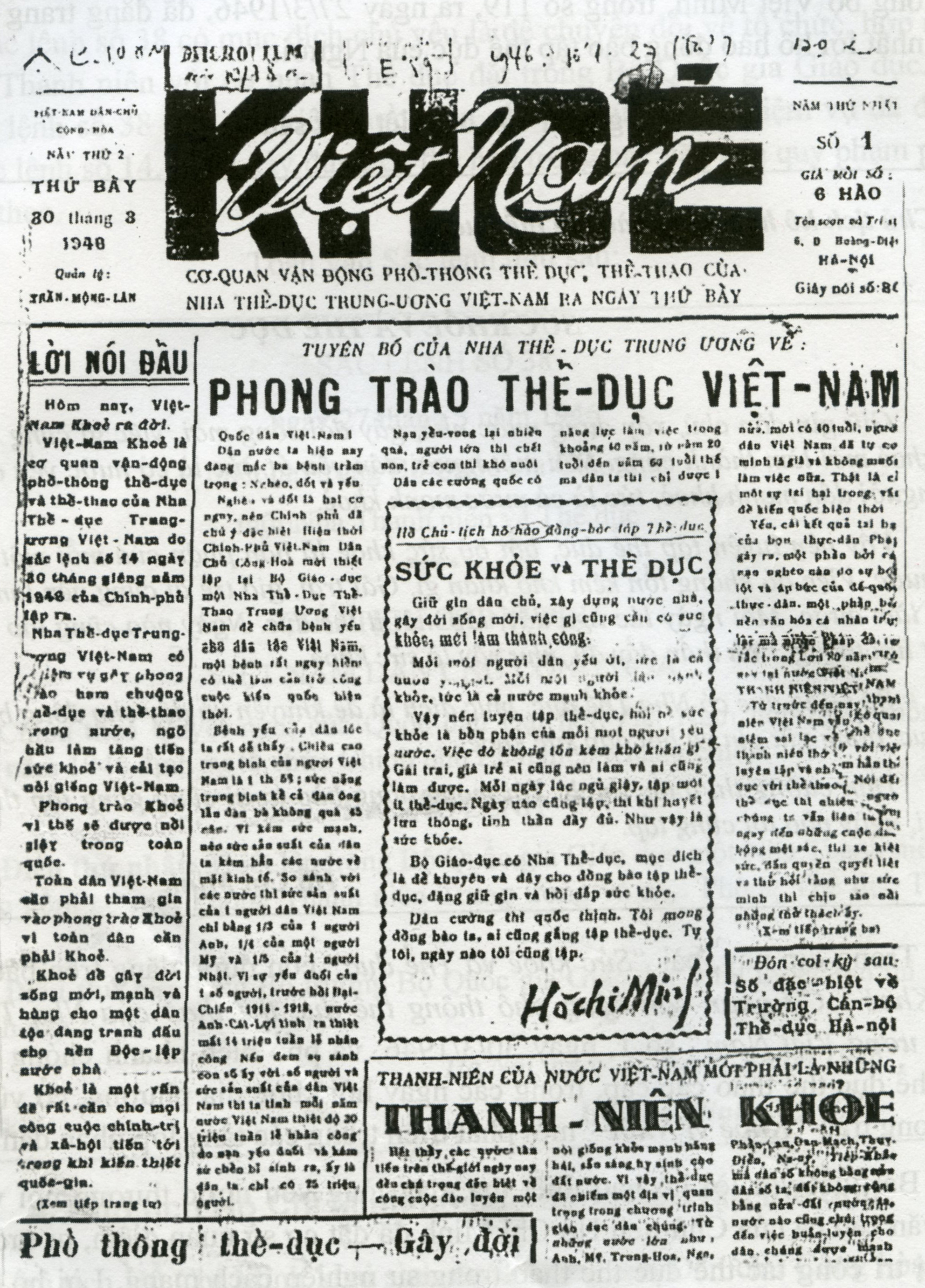 2. "Lời kêu gọi toàn dân tập thể dục" của Chủ tịch Hồ Chí Minh đăng tải trên ấn phẩm Việt Nam Khỏe năm 1946.