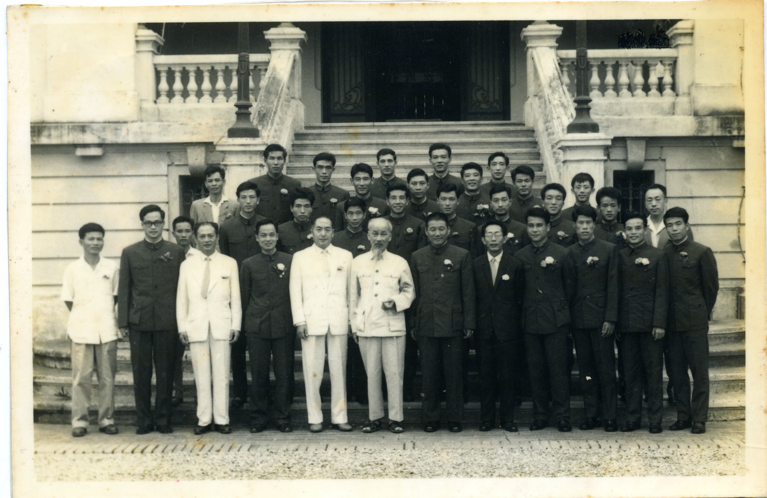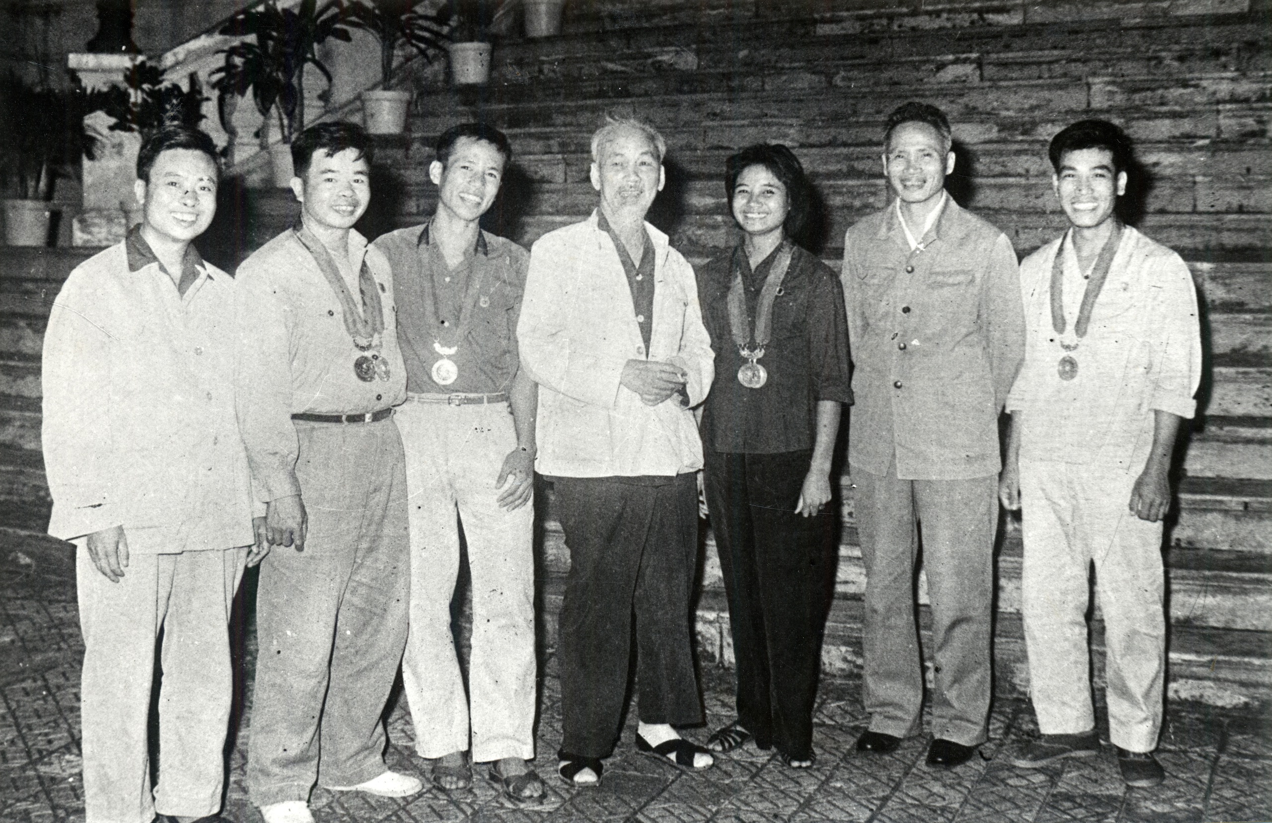 8. Bác Hồ và Thủ tướng Phạm Văn Đồng chụp ảnh lưu niệm cùng các vận động viên giành thành tích cao tại Đại hội Ganefo 1966.