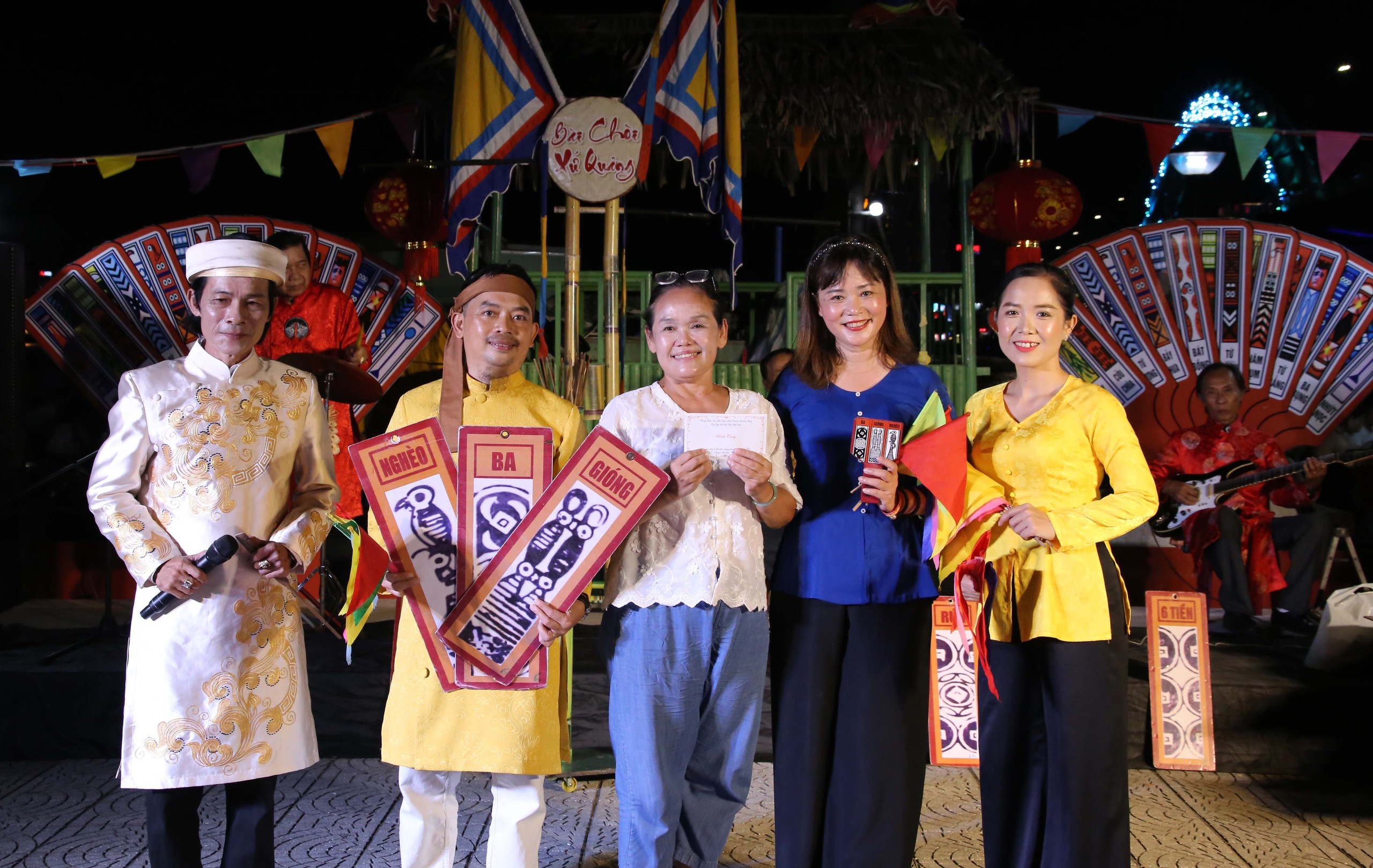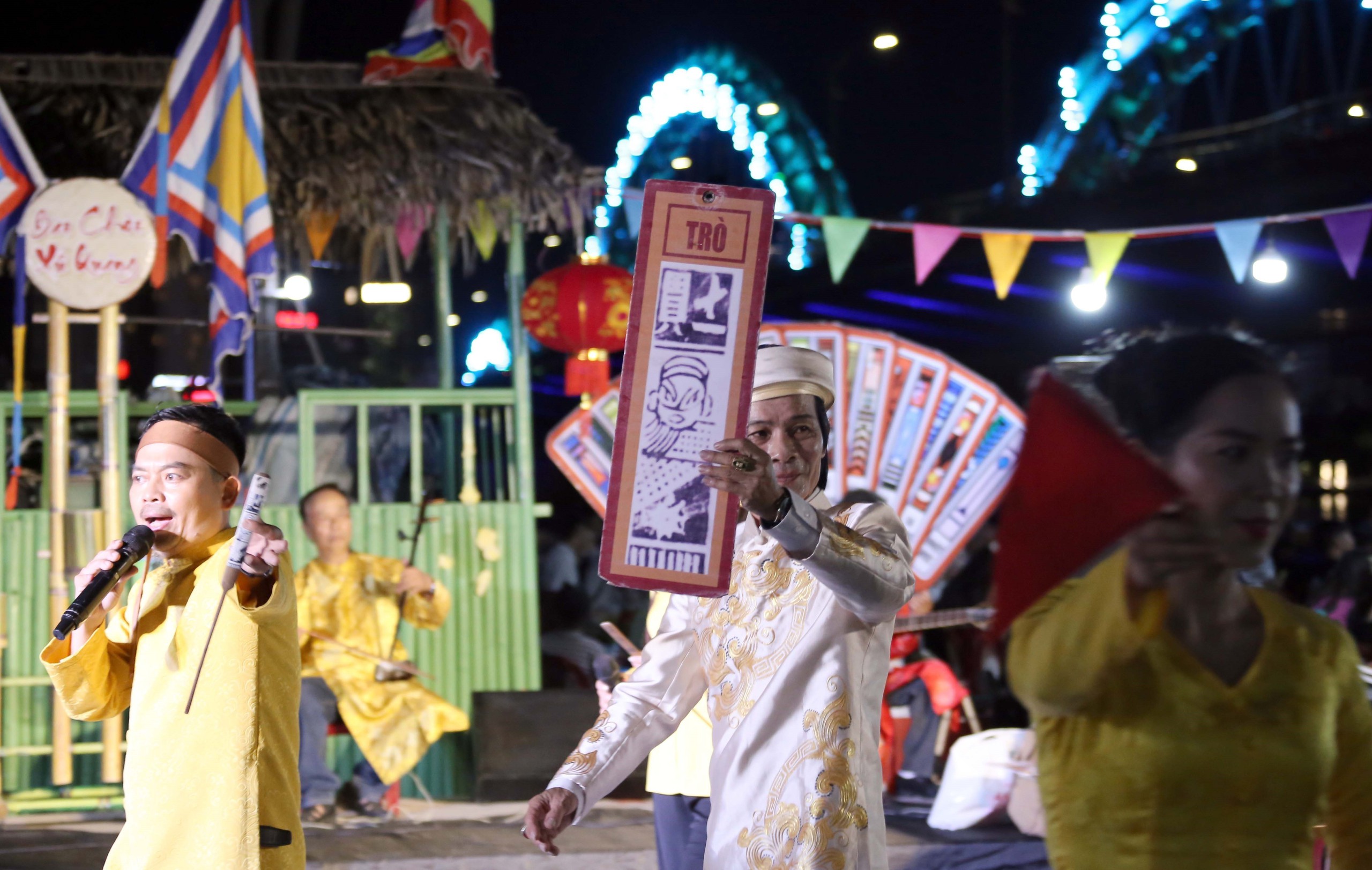 Trình diễn hô hát bài chòi để phục vụ người dân và du khách tại công viên bờ Đông cầu Rồng (Đà Nẵng). Các hoạt động này đã góp phần gìn giữ và phát huy các giá trị nghệ thuật Bài Chòi đã được UNESCO công nhận là Di sản văn hóa phi vật thể đại diện của nhân loại vào năm 2017. Ảnh: Trần Lê Lâm – TTXVN