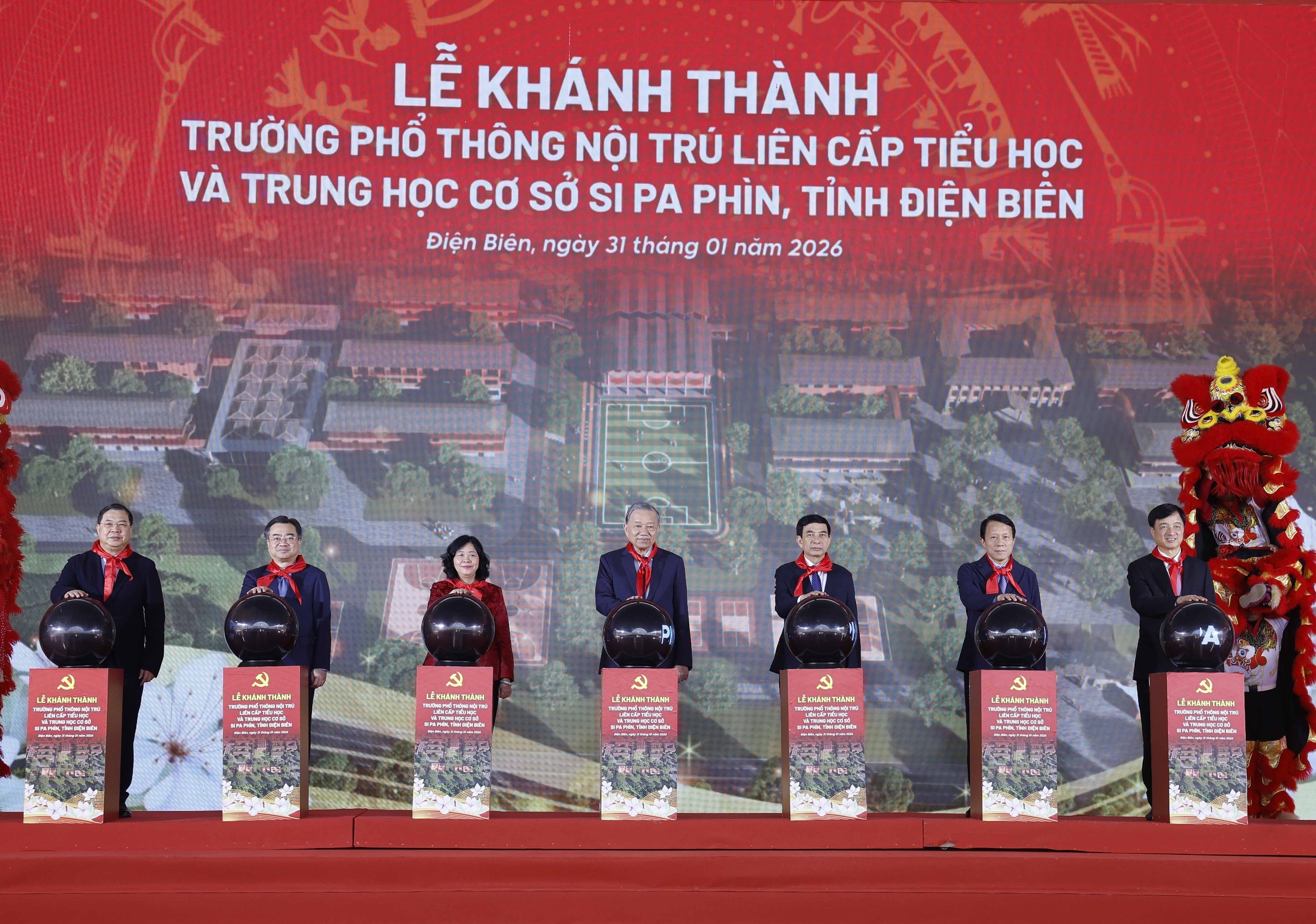 Tổng Bí thư Tô Lâm và đại biểu thực hiện nghi thức khánh thành Trường Phổ thông nội trú liên cấp Tiểu học và THCS Si Pa Phìn, sáng 31/1/2026