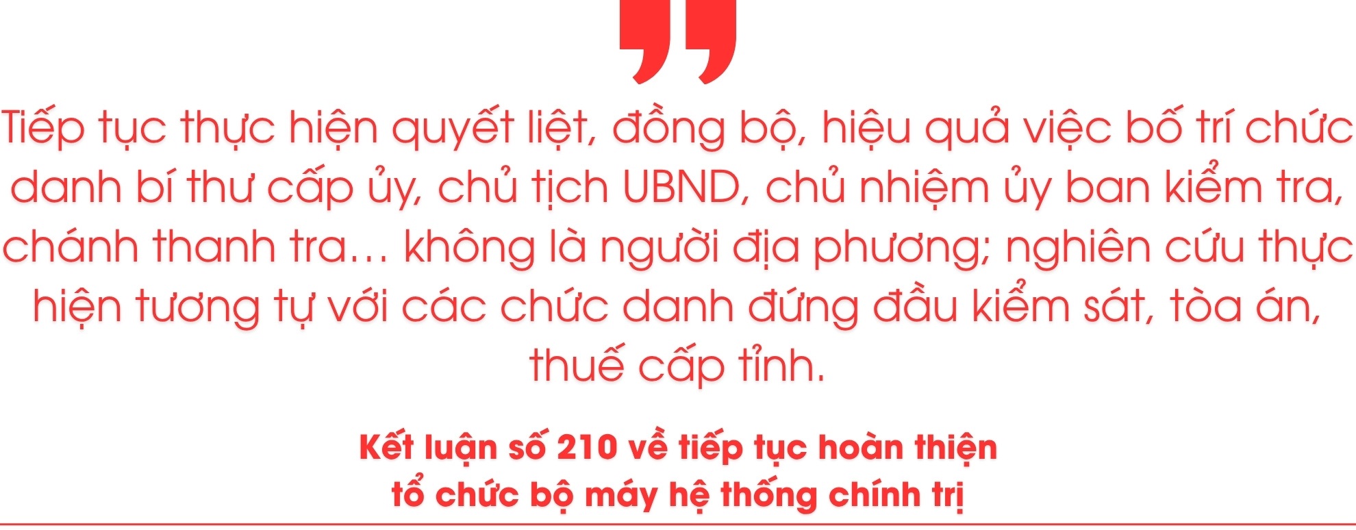 "Tiếp tục thực hiện quyết liệt, đồng bộ, hiệu quả việc bố trí chức danh bí thư cấp ủy, chủ tịch ủy ban nhân dân, chủ nhiệm ủy ban kiểm tra, chánh thanh tra... không phải là người địa phương; nghiên cứu thực hiện việc bố trí chức danh người đứng đầu các ngành, lĩnh vực: Kiểm sát, toà án, thuế cấp tỉnh không phải là người địa phương".