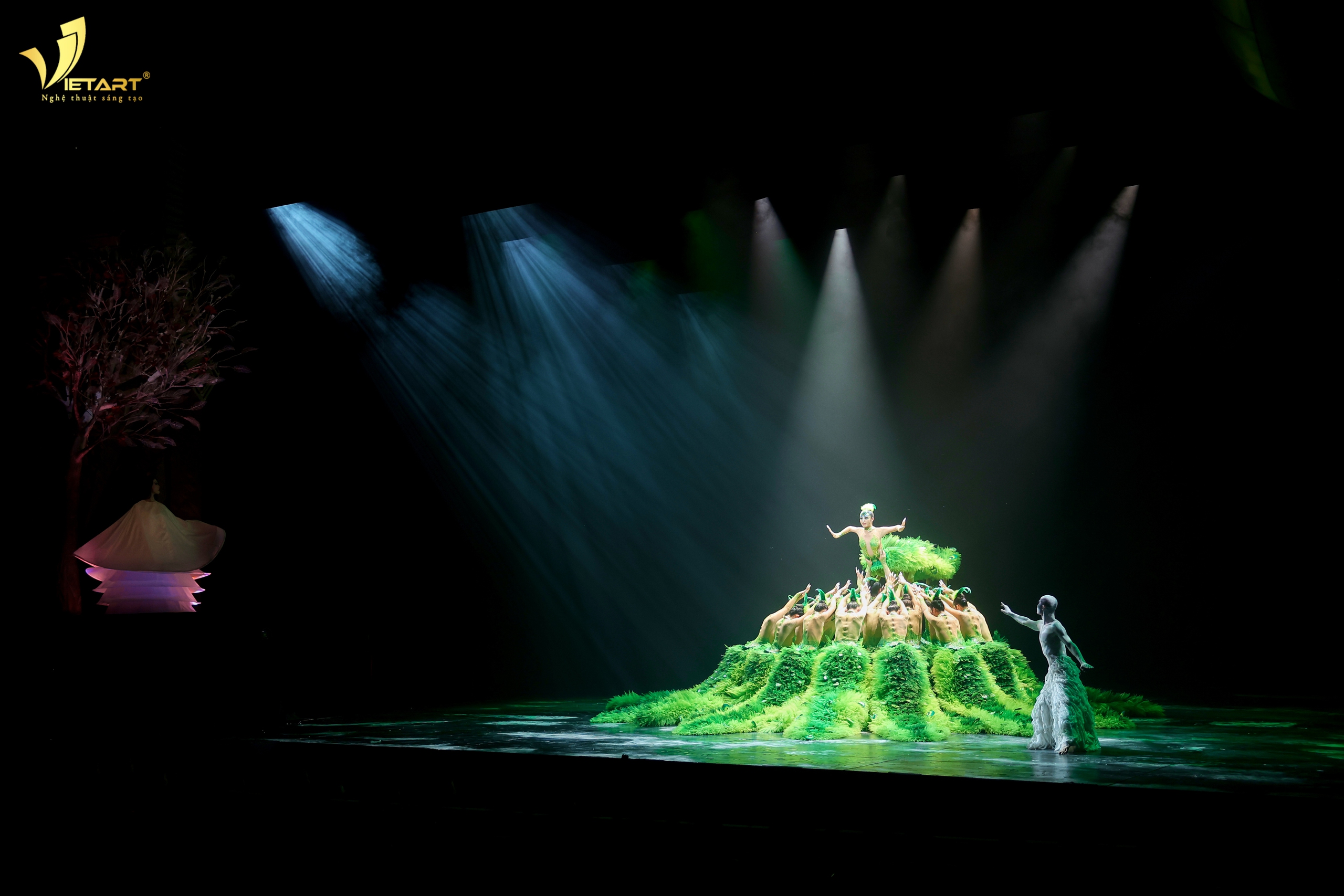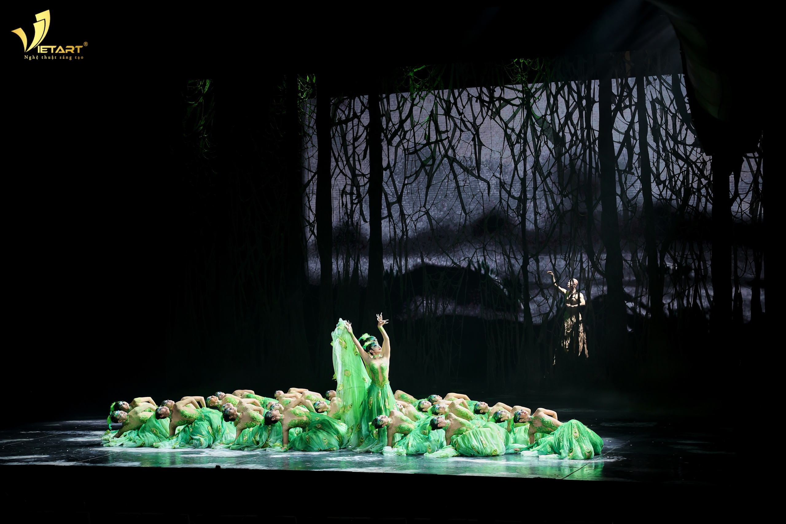 Ý niệm về Luân hồi : Sinh ra - lớn lên - mất đi - rồi lại tái sinh. Những vòng xoay ấy giống như bánh xe của kiếp nhân sinh, cứ lặng lẽ quay qua bao phận người, bao số phận, bao câu chuyện… Và giữa dòng chảy ấy, tôi ấn tượng nhất hình tượng Khổng tước nam xuất hiện trong chương 3: Thu - thật kiêu hãnh, đẹp đẽ, rực rỡ như chính bản thể của cái đẹp trong đời sống. Nhưng vẻ đẹp ấy cũng mong manh. Phân đoạn chiếc đuôi - biểu tượng của kiêu hãnh và bản thể bị đánh cắp khiến cả không gian sân khấu chùng xuống. Người nghệ sĩ đã đẩy cơ thể mình vào một cuộc vật lộn dữ dội: những chuyển động vỡ ra, xoắn lại, đau đớn, như một sinh thể đang cố giữ lại phần linh hồn của chính mình. Trong vòng quay của thời gian và luân hồi, vẻ đẹp đôi khi bị tước đoạt, kiêu hãnh đôi khi bị thử thách, và mỗi sinh mệnh đều phải đi qua những mất mát để hiểu được giá trị của chính mình. Phân đoạn ấy khiến tôi thực sự lặng đi. Những chuyển động đương đại dữ dội, những cú xoắn của cơ thể, những bước múa như vỡ ra… tất cả chạm tới tầng sâu nhất của nỗi đau khi cái đẹp bị tước đoạt, người nghệ sĩ đã đẩy cơ thể mình đến ranh giới của cảm xúc: những chuyển động vỡ ra, quằn quại, như một sinh thể đang tuyệt vọng giữ lại phần linh hồn của chính mình…