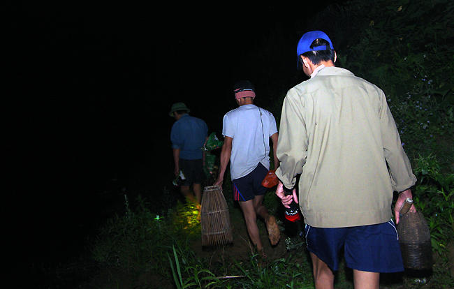 Chia sẻ kinh nghiệm, anh Hoàng Sơn cho rằng, việc đi nửa đêm là sai sách. Các cụ ở thôn vẫn hay nói, "Tôm chạng vạng, cá rạng đông". Muốn bắt được nhiều tôm phải đi lúc trời chạng vạng, nếu sau cơn mưa càng tốt. Còn muốn kiếm cá, phải đi từ sáng sớm, lúc đó cá đi săn mồi, dễ câu được nhiều. Nhưng nói gì thì nói, sau con mưa đầu mùa, không khí mát mẻ, nước trong lành, dù đi vào lúc gần nửa đêm chúng tôi vẫn kiếm đủ dùng cho cả chục người ăn khuy.