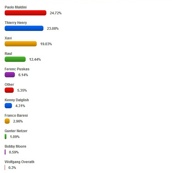 Trong cuộc khảo sát được trang Goal tiến hành trong 3 ngày vừa qua, 24,72% số độc giả bầu Maldini là cầu thủ lớn nhất từ trước tới nay chưa một lần được trao Quả bóng Vàng. Hậu vệ hào hoa của Milan và ĐT Italia chỉ từng 2 lần giành Quả bóng Đồng vào các năm 1994 và 2003. Xếp sau Maldini trong danh sách này là huyền thoại của Arsenal, Thierry Henry với 23,08% số phiếu bầu chọn.