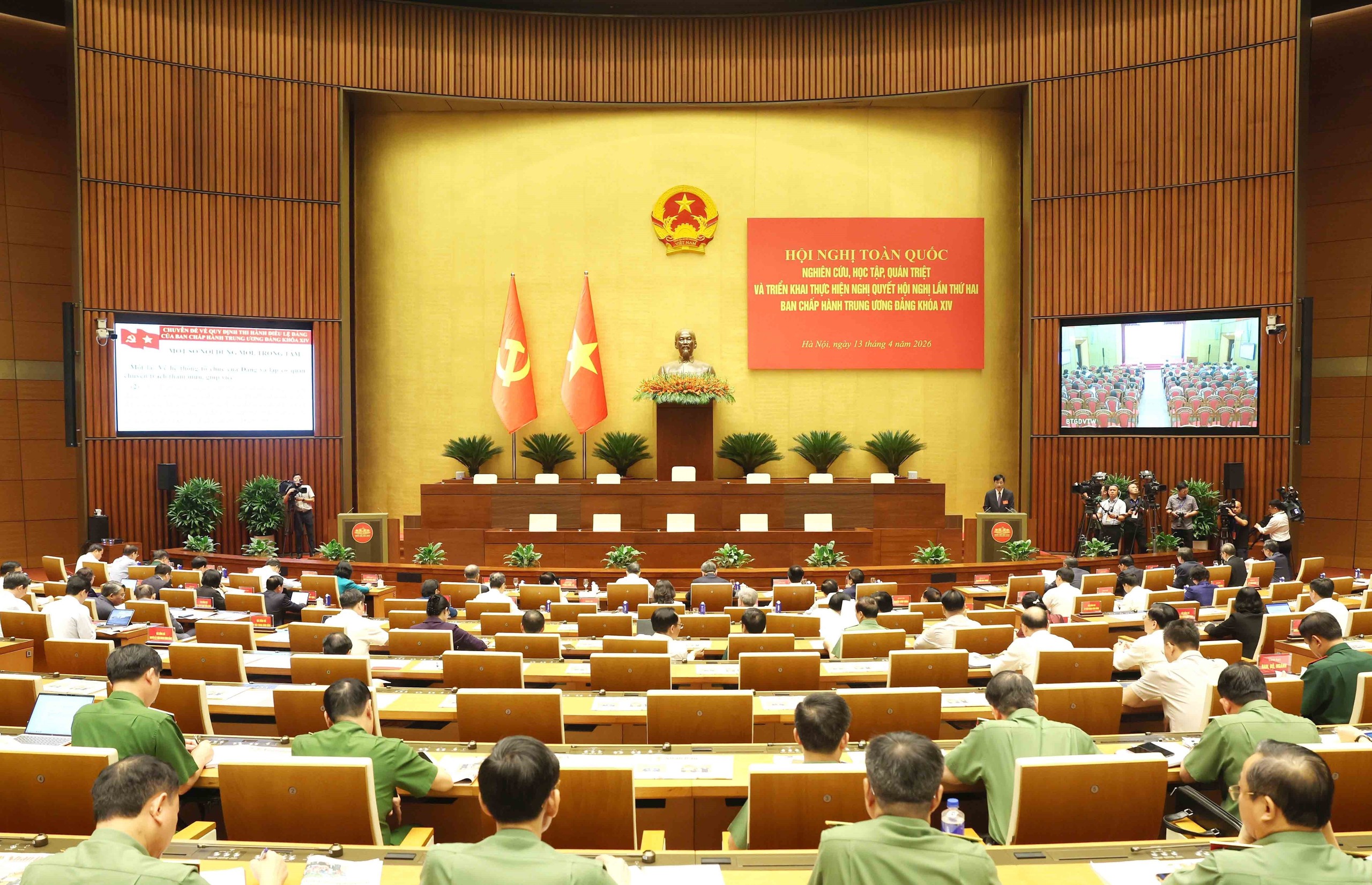 Sáng 13/4, tại Hà Nội, Bộ Chính trị, Ban Bí thư Trung ương Đảng đã tổ chức Hội nghị toàn quốc nghiên cứu, học tập, quán triệt và triển khai thực hiện Nghị quyết Hội nghị lần thứ hai Ban Chấp hành Trung ương Đảng khóa XIV.