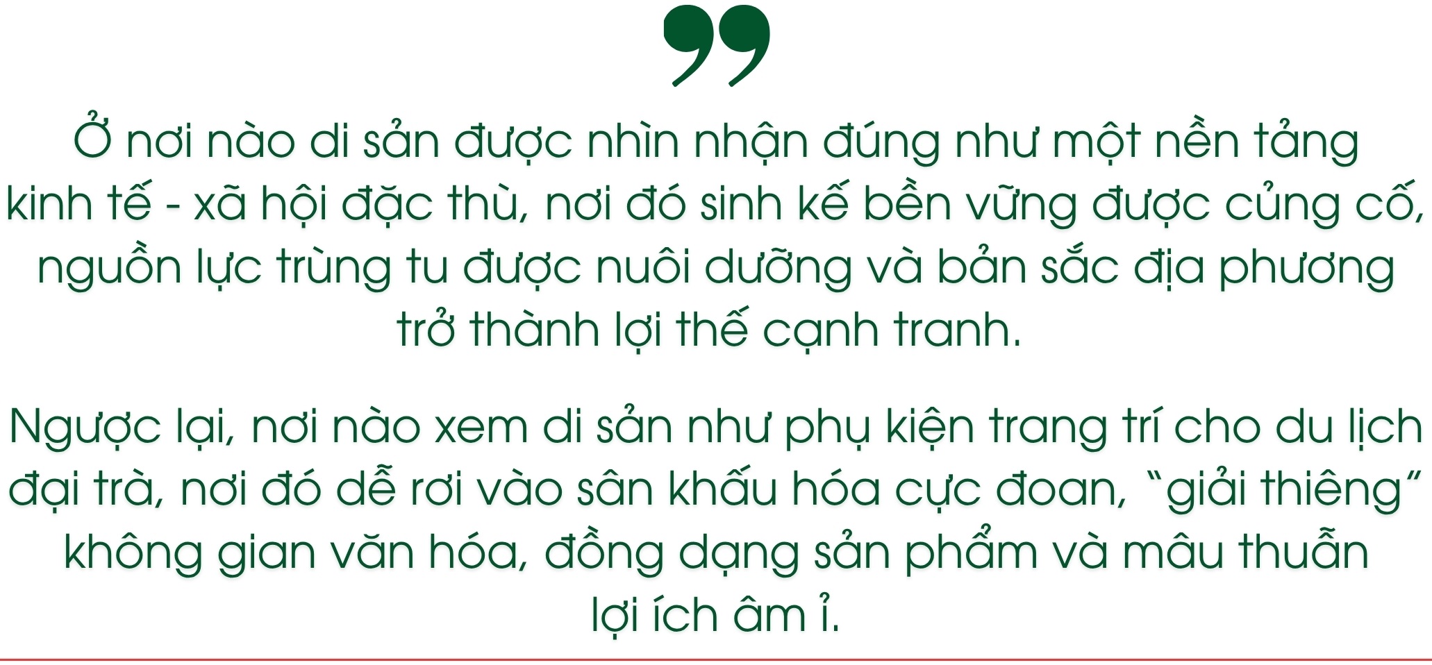 Ngược lại, theo ông, nơi nào xem di sản như phụ kiện trang trí cho du lịch đại trà, nơi đó dễ rơi vào sân khấu hóa cực đoan, "giải thiêng" không gian văn hóa, đồng dạng sản phẩm và mâu thuẫn lợi ích âm ỉ.