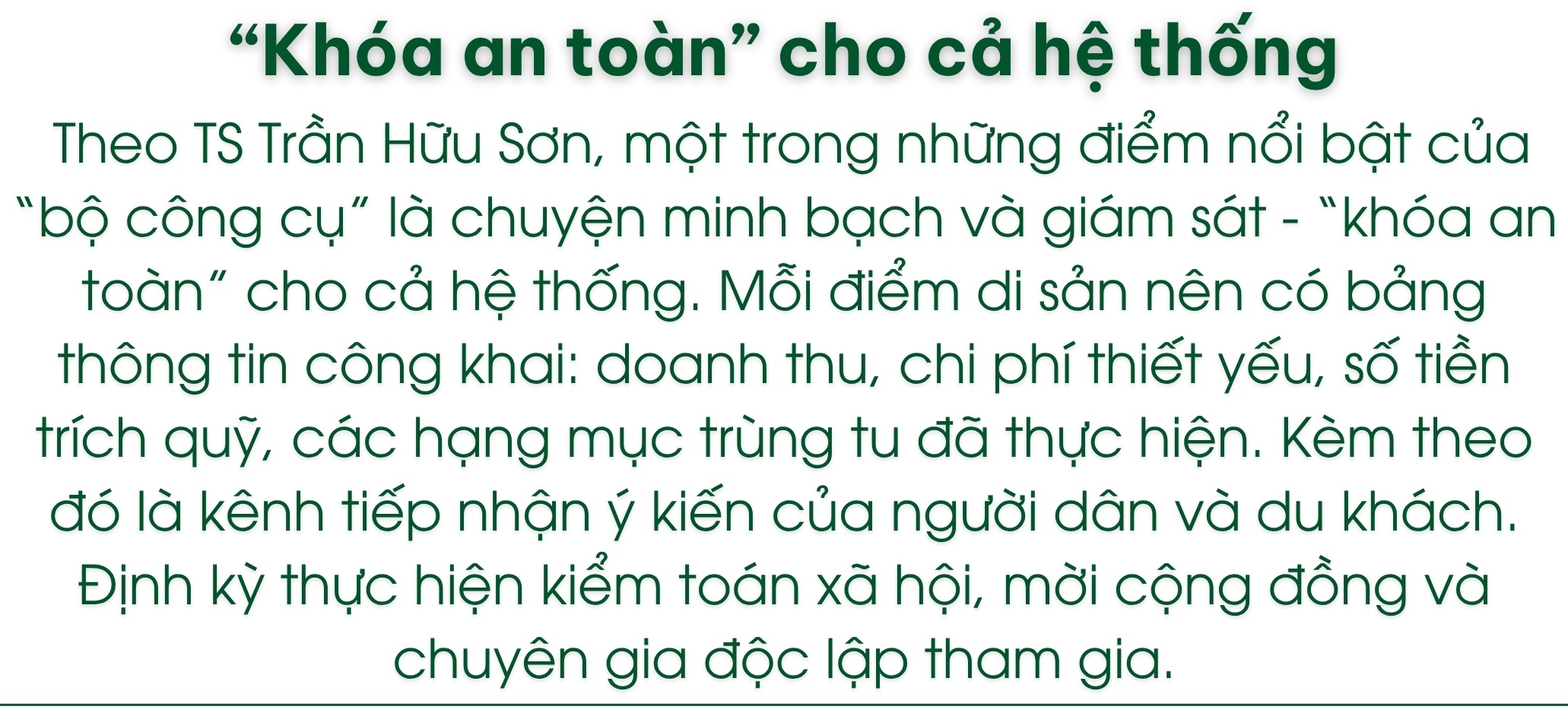 Về tài chính, TS Trần Hữu Sơn đề xuất cơ chế "lấy nguồn lực từ khai thác để nuôi dưỡng bảo tồn". Hạt nhân của cơ chế này là Quỹ trùng tu - tôn tạo di sản. Quỹ được trích từ vé tham quan, tiền cấp phép dùng biểu tượng, một phần doanh thu dịch vụ, cùng với đóng góp tự nguyện của doanh nghiệp và người dân. Quỹ phải được quản lý công khai, có đại diện của cộng đồng, chuyên gia, chính quyền và doanh nghiệp, và ưu tiên chi cho những việc thiết thực: trùng tu hạng mục xuống cấp, phục hồi nghề truyền thống, dạy - học trong cộng đồng, số hóa tư liệu quý.