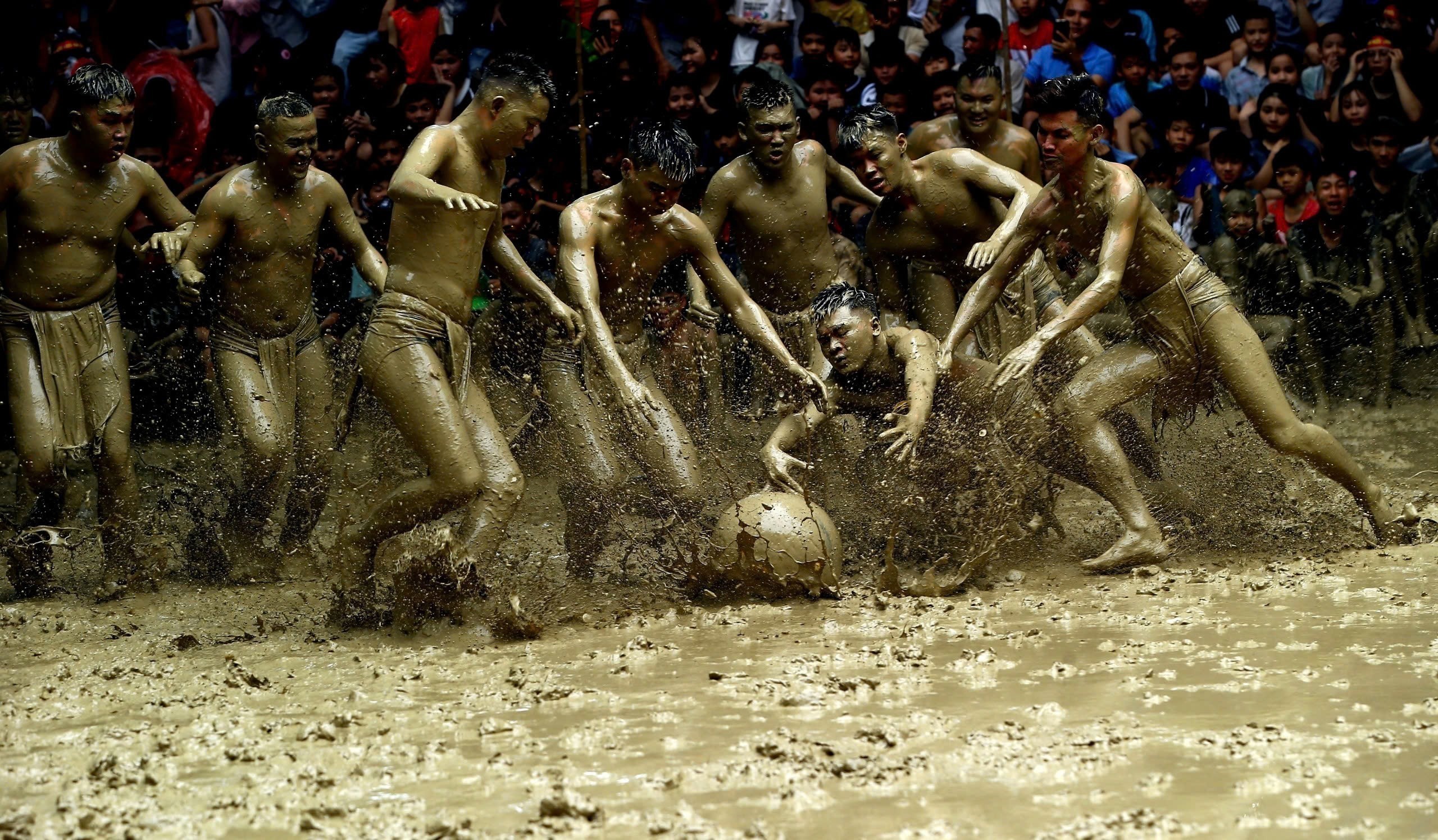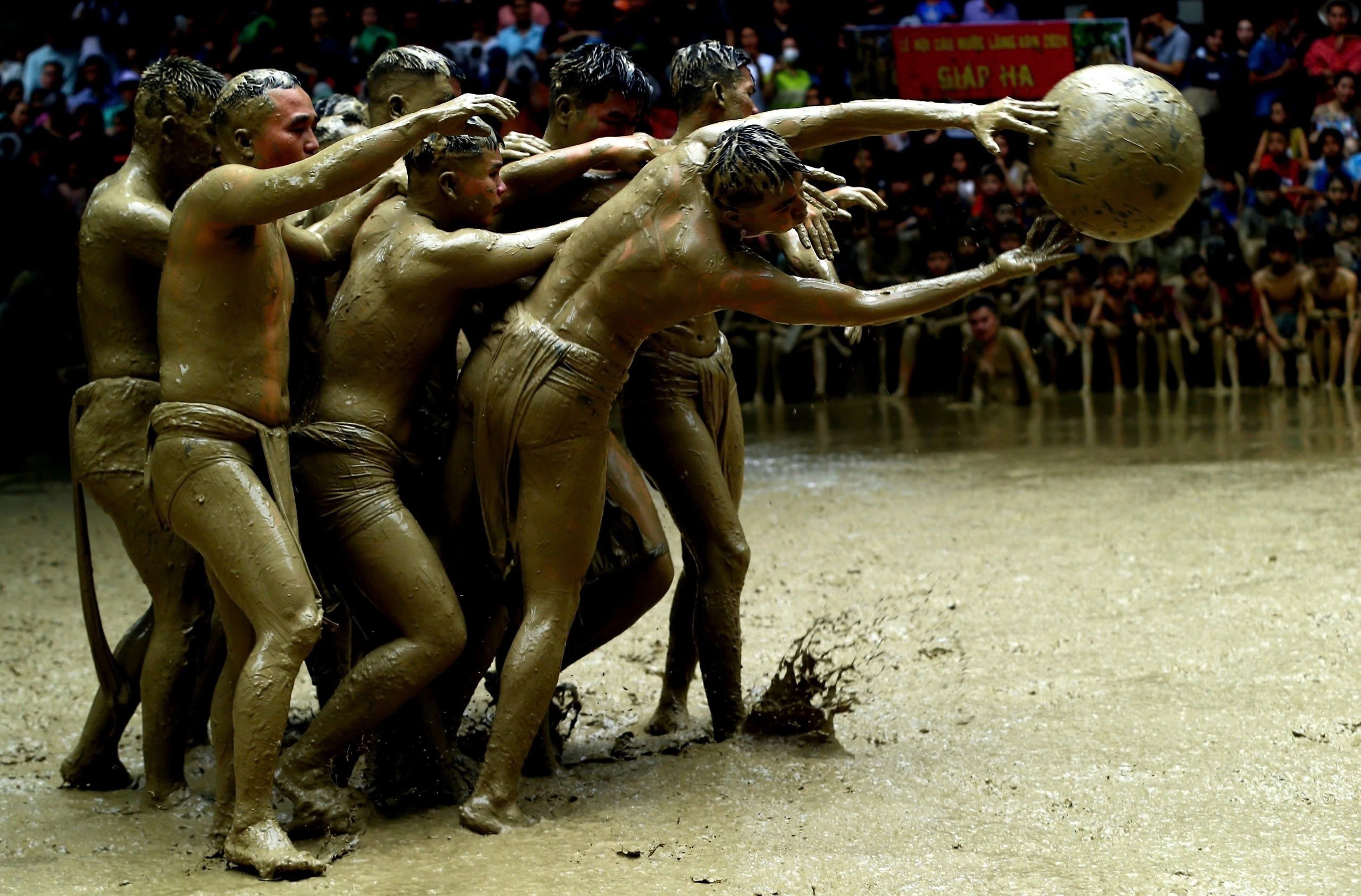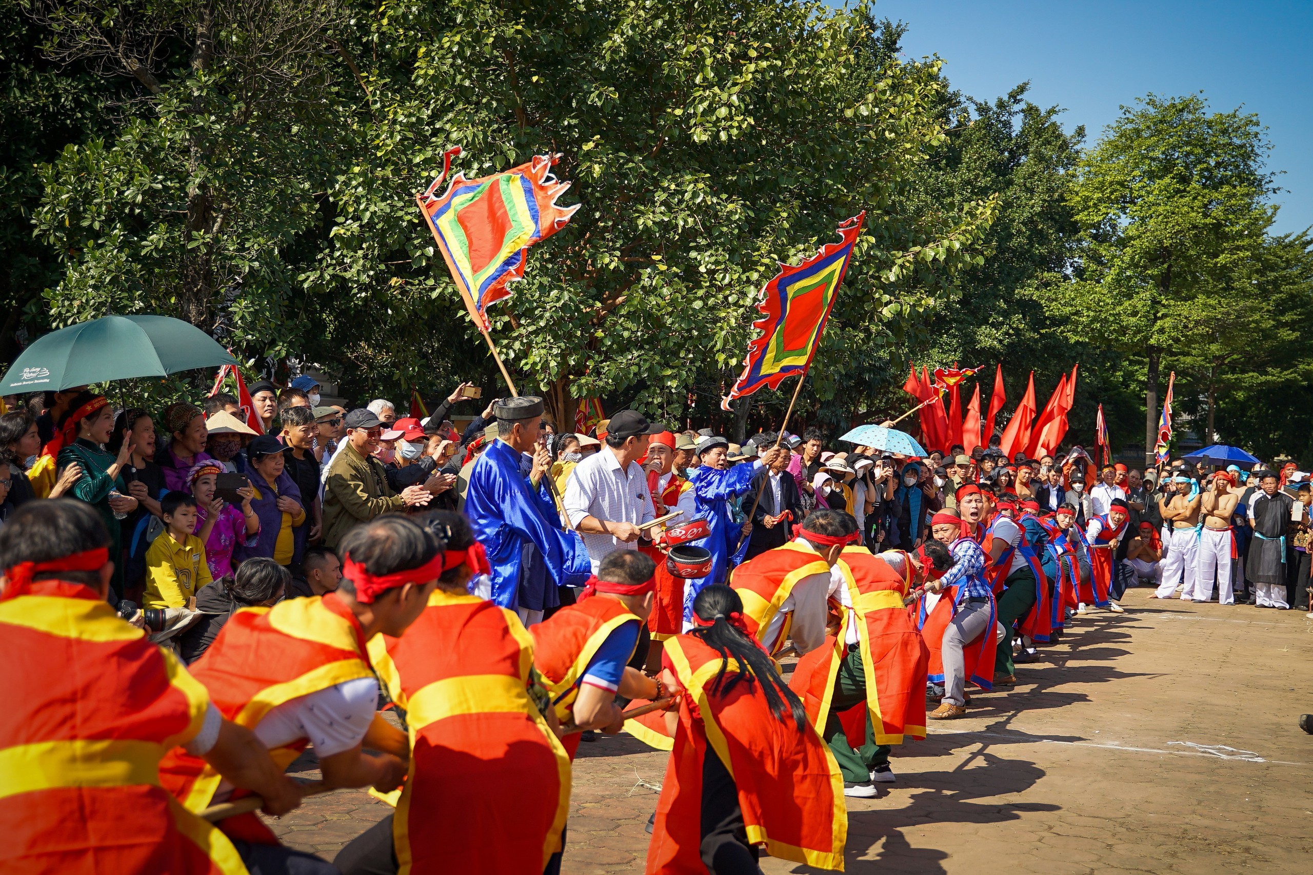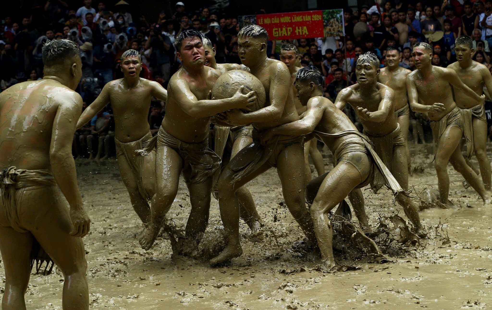 Hội vật cầu được tổ chức trên sân chính của đền thờ Thánh Tam Giang (Bắc Giang, nay là Bắc Ninh). Ảnh thuộc bộ ảnh giành giải Nhất hạng mục phóng sự ảnh của Tổ chức các hãng thông tấn châu Á - Thái Bình Dương (OANA) năm 2024. Ảnh: An Thành Đạt - TTXVN