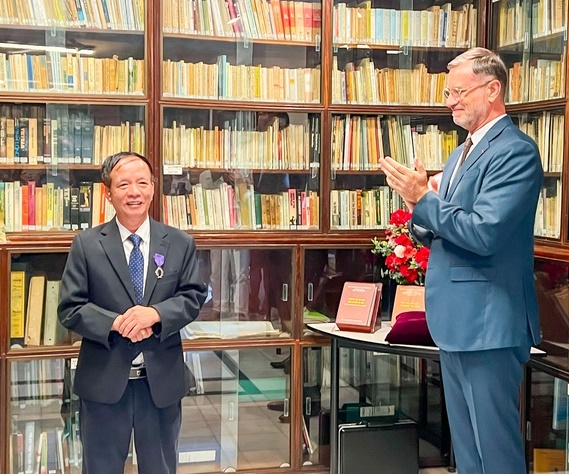 Đại sứ Pháp tại Việt Nam Olivier Brochet (phải) trao Huân chương Hiệp sĩ Cành cọ Hàn lâm của Chính phủ Pháp cho TS Trần Hữu Sơn