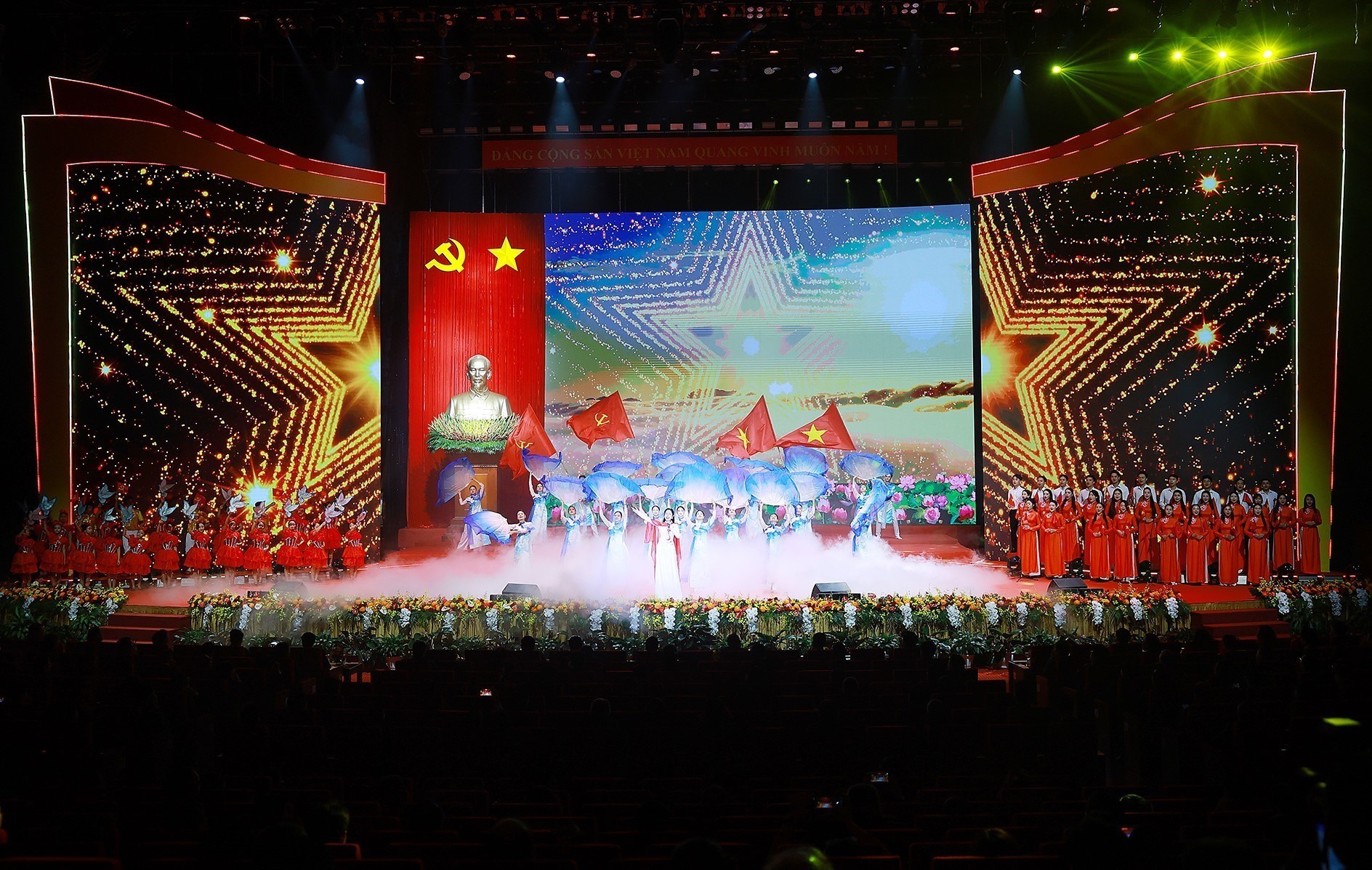 Đồng chí Phạm Minh Chính, Ủy viên Bộ Chính trị, Bí thư Đảng ủy, Thủ tướng Chính phủ tặng hoa các nghệ sĩ biểu diễn chào mừng Đại hội
