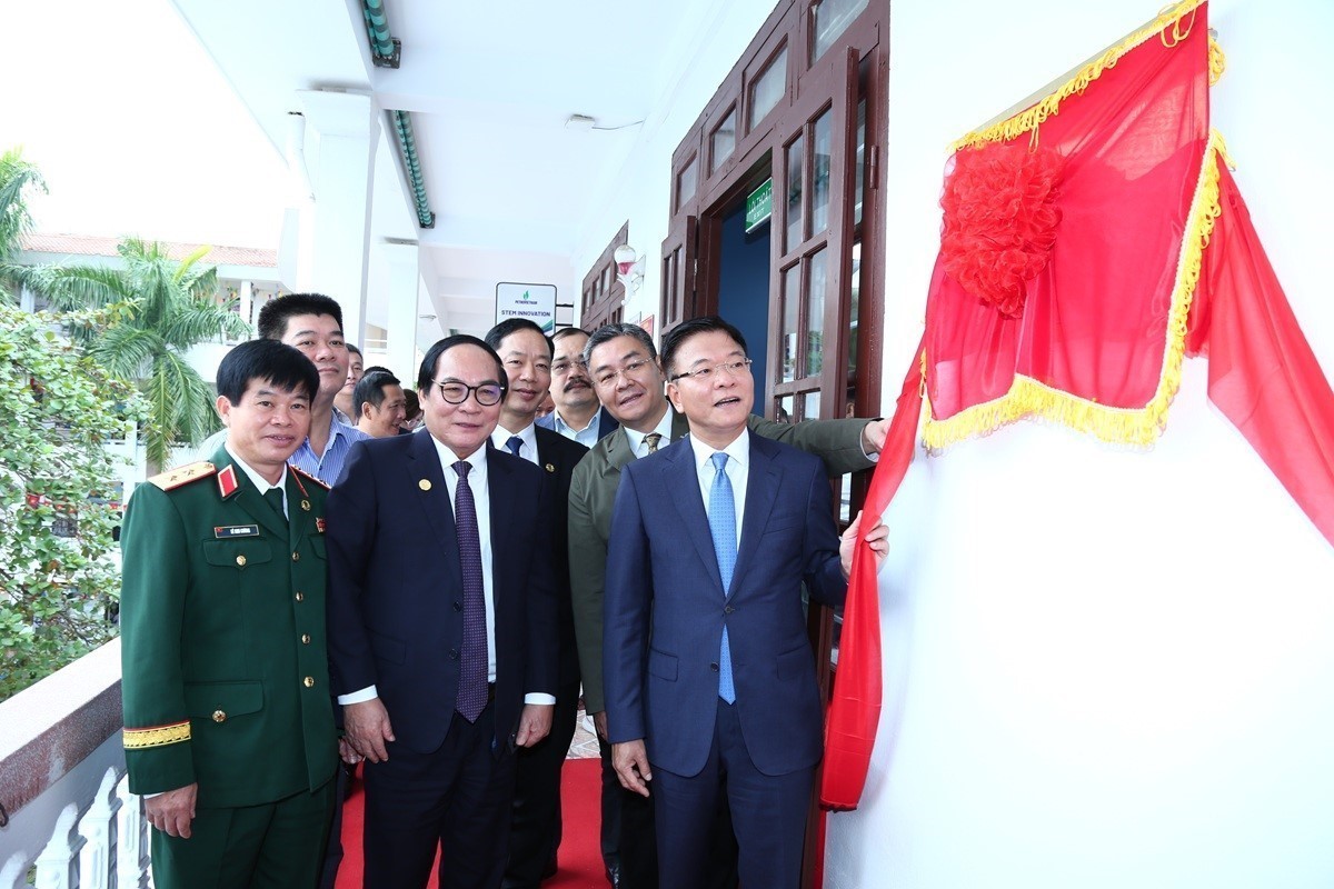 Phó Thủ tướng Lê Thành Long cùng các đại biểu thực hiện nghi thức khánh thành và tham quan phòng thực hành giáo dục STEM tại Trường THPT Chuyên Lam Sơn. Ảnh: TTXVN phát