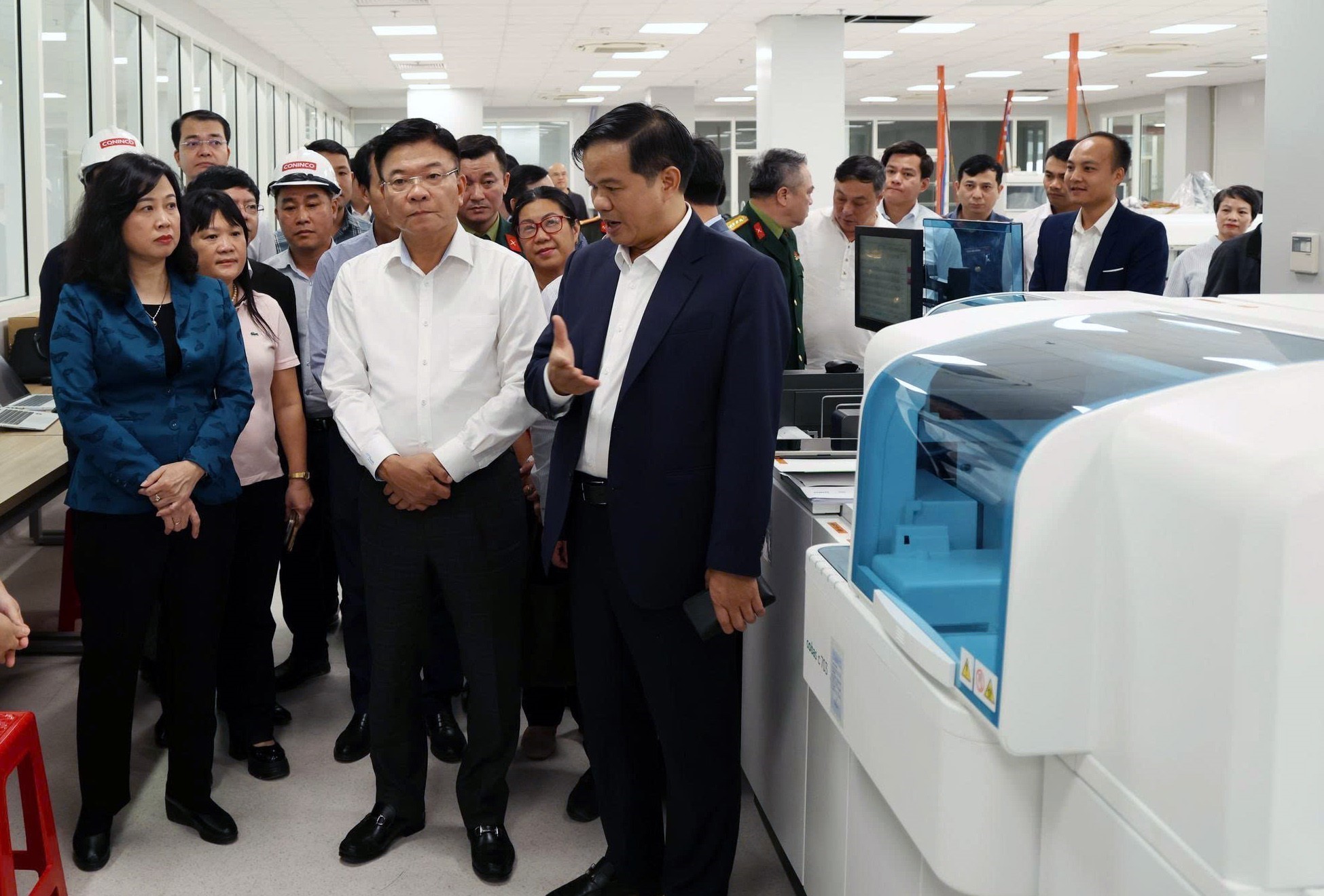 Phó Thủ tướng Chính phủ Lê Thành Long cùng đoàn công tác kiểm tra tại cơ sở 2 Bệnh viện Bạch Mai. Ảnh: Nguyễn Chinh - TTXVN