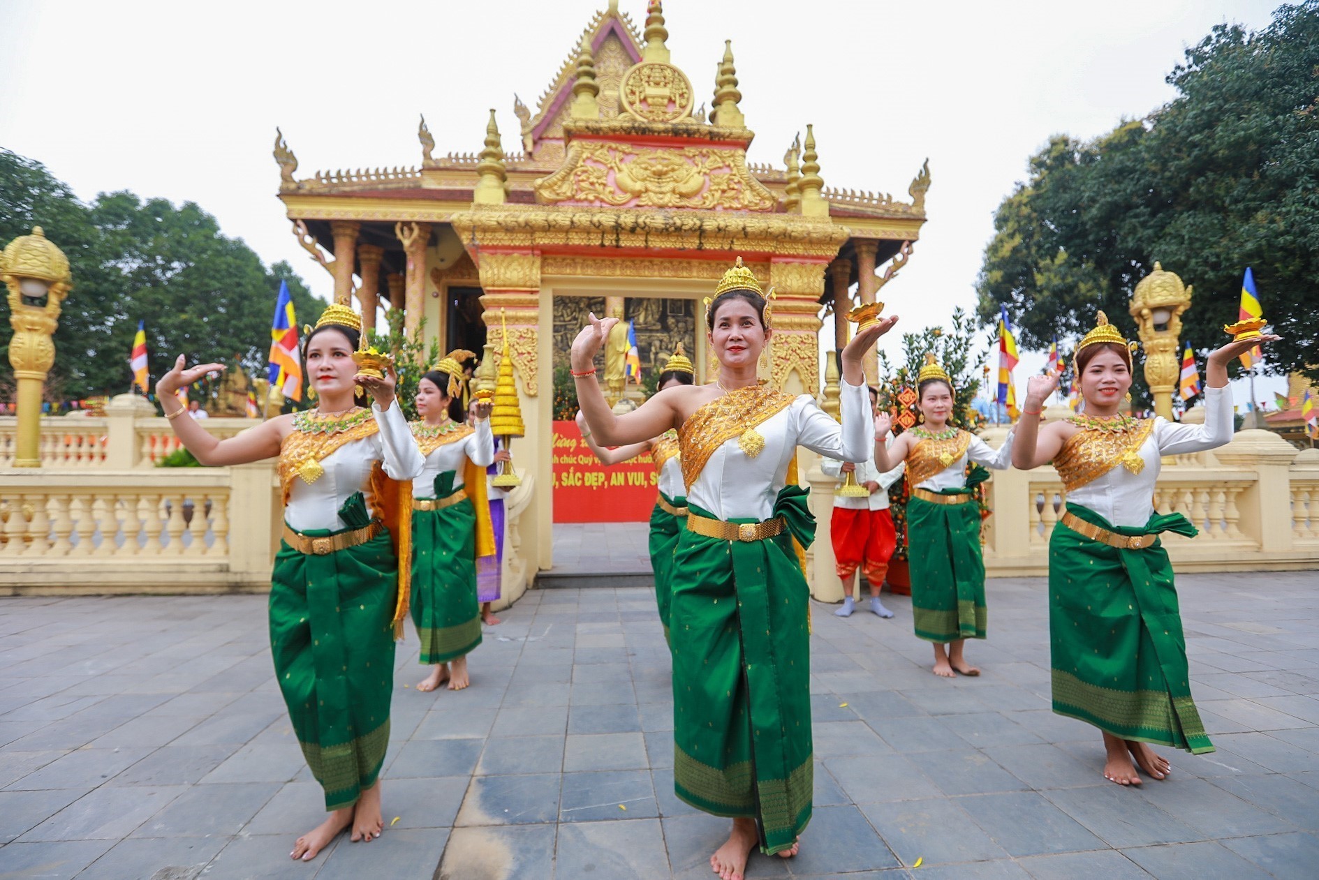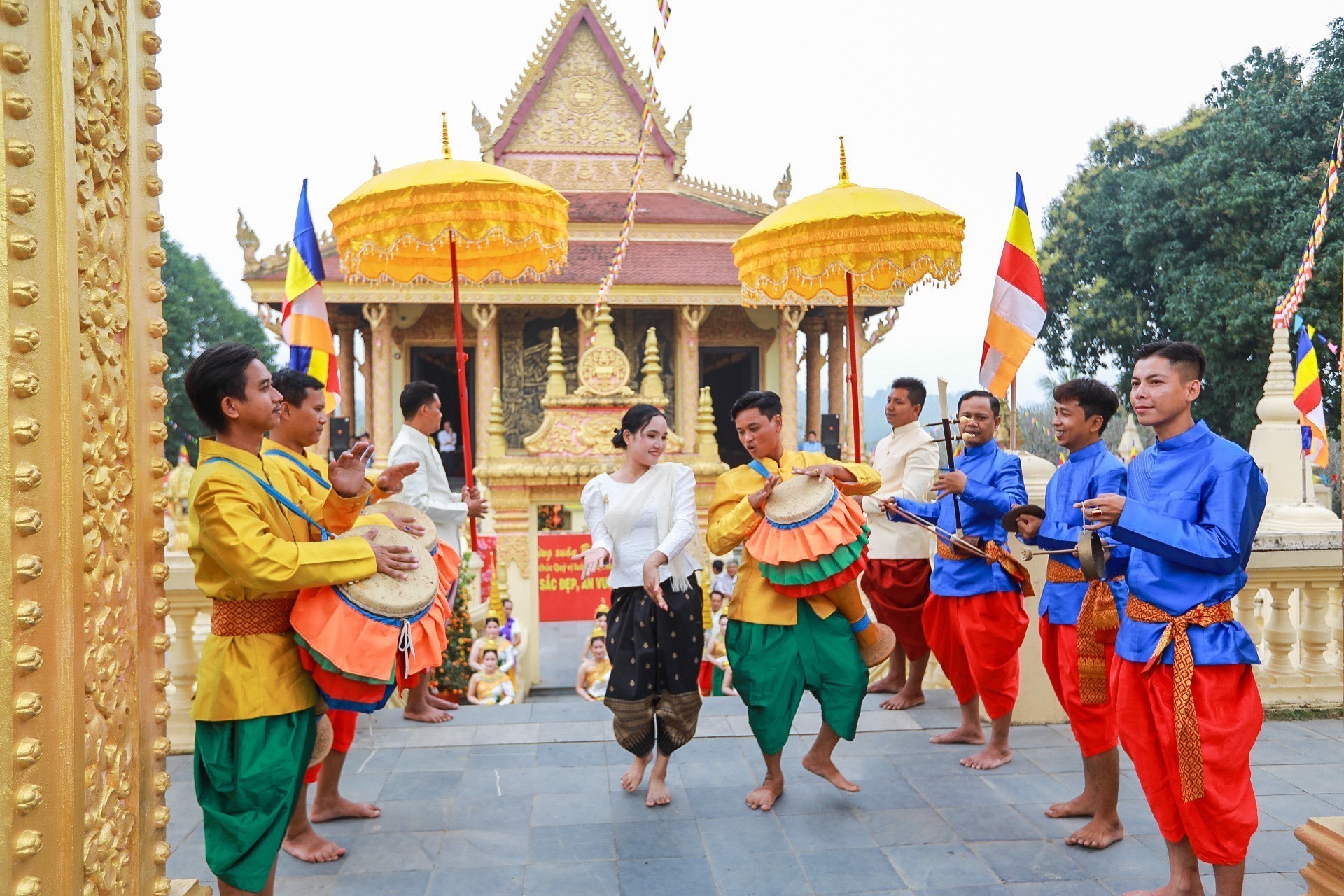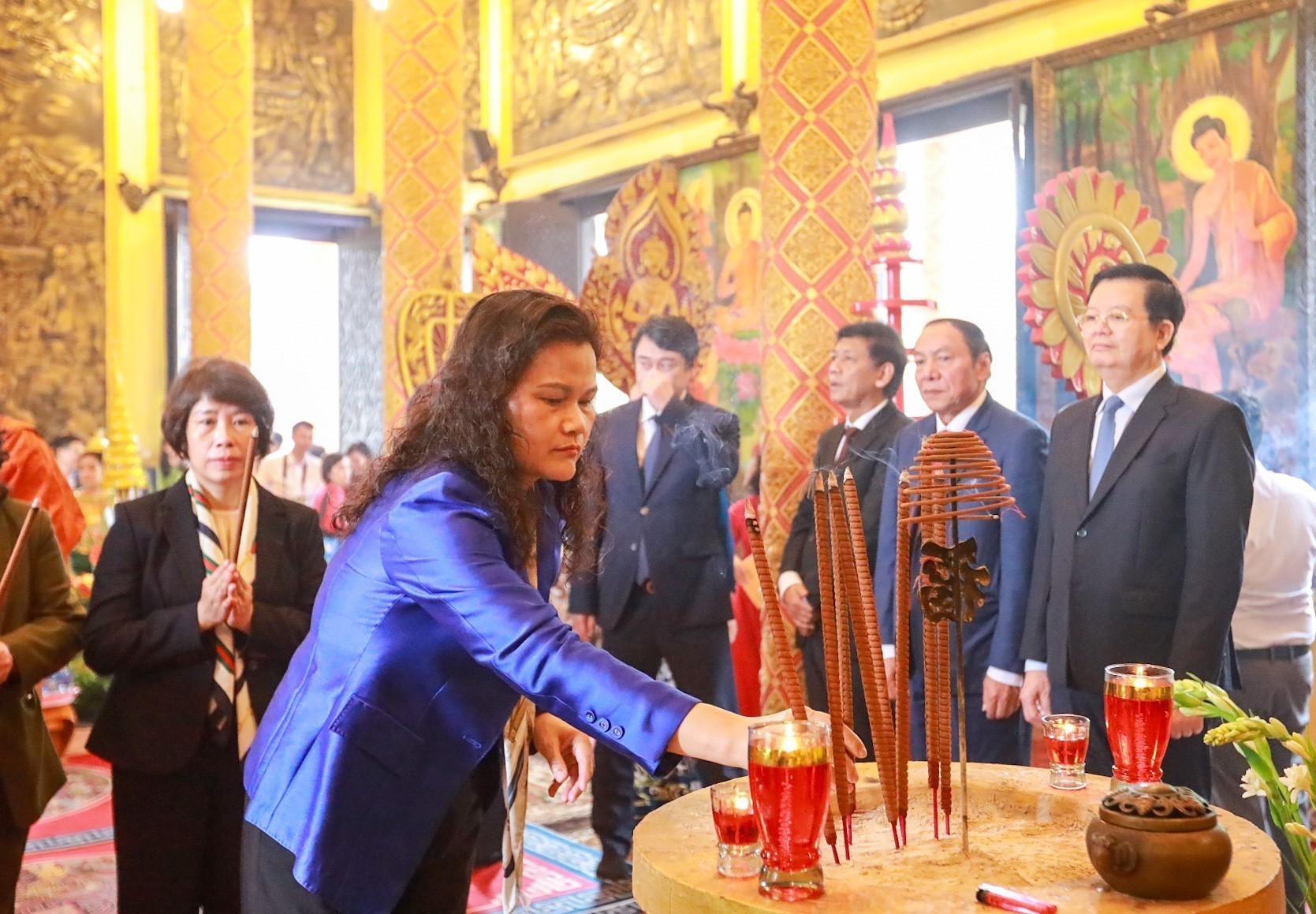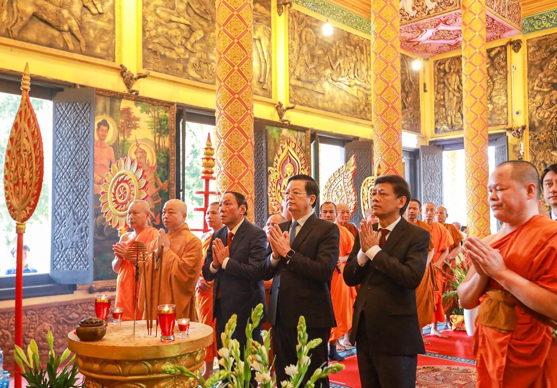 Các đại biểu tham dự nghi thức rước Tê-vê-đa của dân tộc Khmer và dâng hương tại chùa Khmer. Ảnh: Khánh Hoà - TTXVN