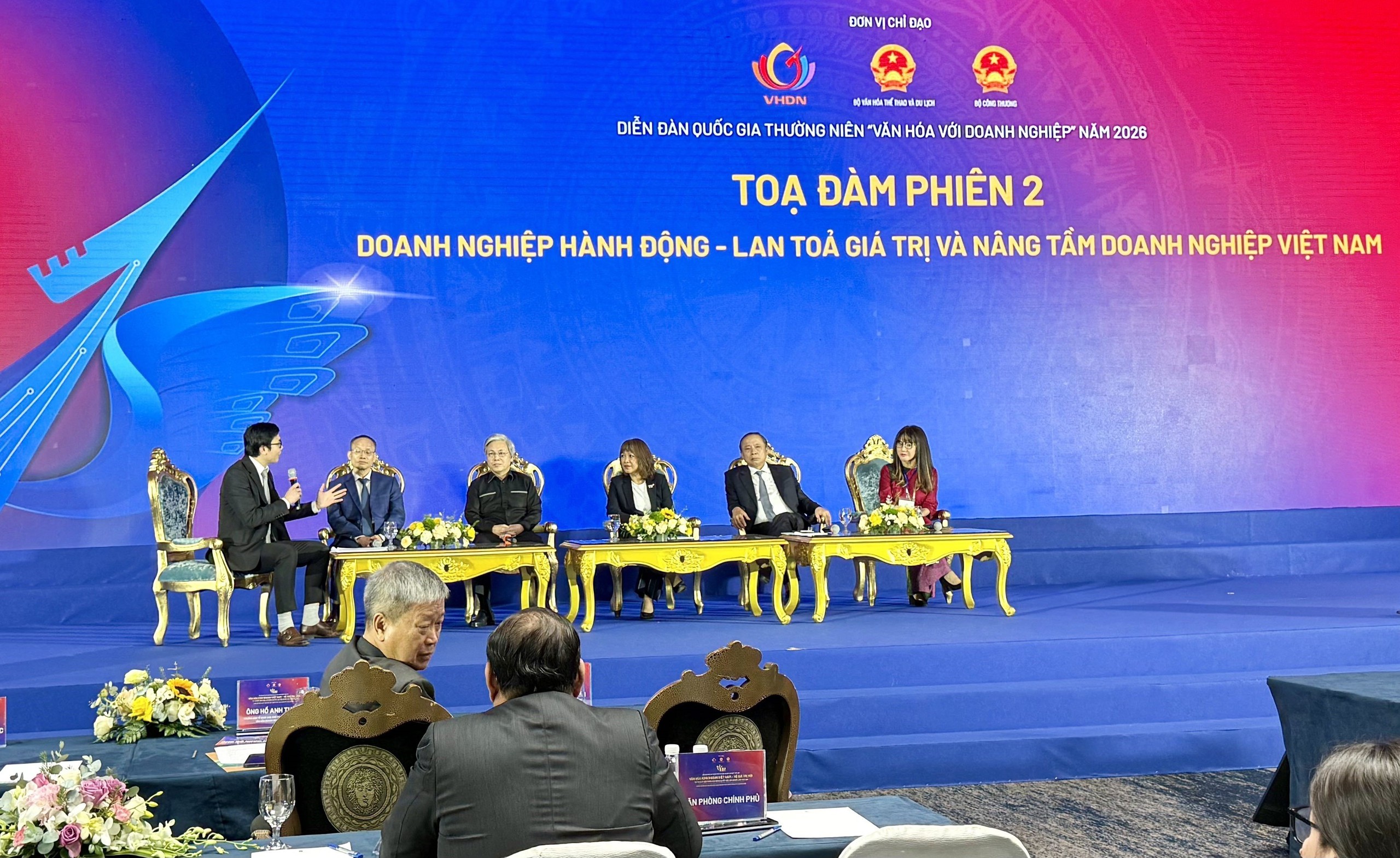 Diễn đàn Quốc gia “Văn hóa với Doanh nghiệp” có diễn ra 2 phiên tọa đàm, với sự tham gia của các chuyên gia uy tín hàng đầu, tạo tiếng nói đa chiều và phù hợp với thực tiễn. Tại phiên tọa đàm số 1 với chủ đề “Chính phủ kiến tạo - Hoàn thiện thể chế cho hệ giá trị văn hóa kinh doanh mới”, các đại biểu tập trung phân tích tư duy phát triển mới được đặt ra từ Nghị quyết Đại hội XIV, làm rõ vai trò kiến tạo của Nhà nước trong việc xây dựng môi trường kinh doanh minh bạch, thuận lợi cho doanh nghiệp phát triển. Các diễn giả cũng thảo luận về việc hoàn thiện thể chế, định hình hệ giá trị Văn hóa Kinh doanh Việt Nam, tiếp tục hoàn thiện Bộ Tiêu chí Văn hóa Kinh doanh Việt Nam và hướng tới xây dựng Bộ chỉ số Văn hóa Kinh doanh Việt Nam - như một công cụ thúc đẩy sự phát triển bền vững và nâng cao năng lực cạnh tranh quốc gia.