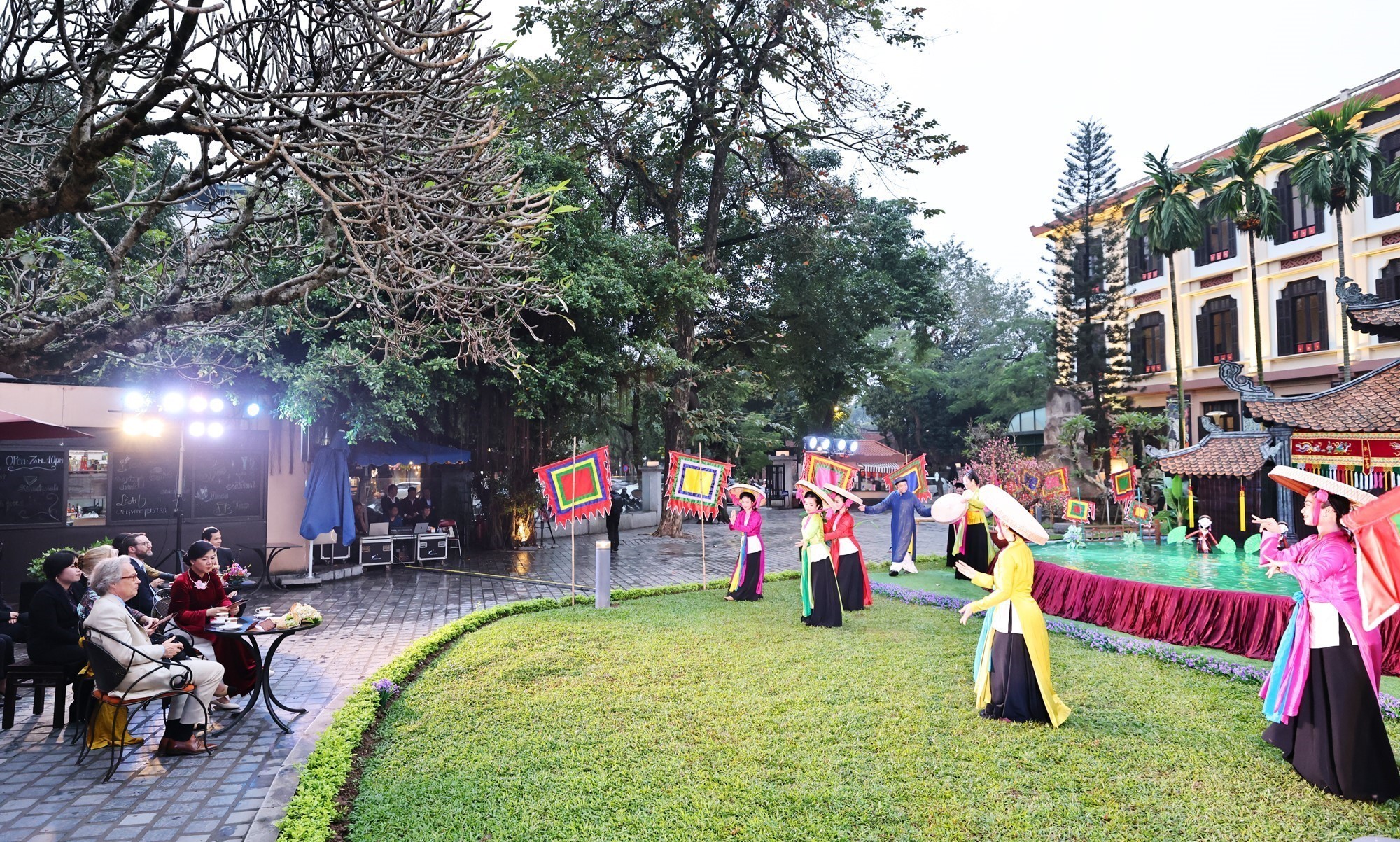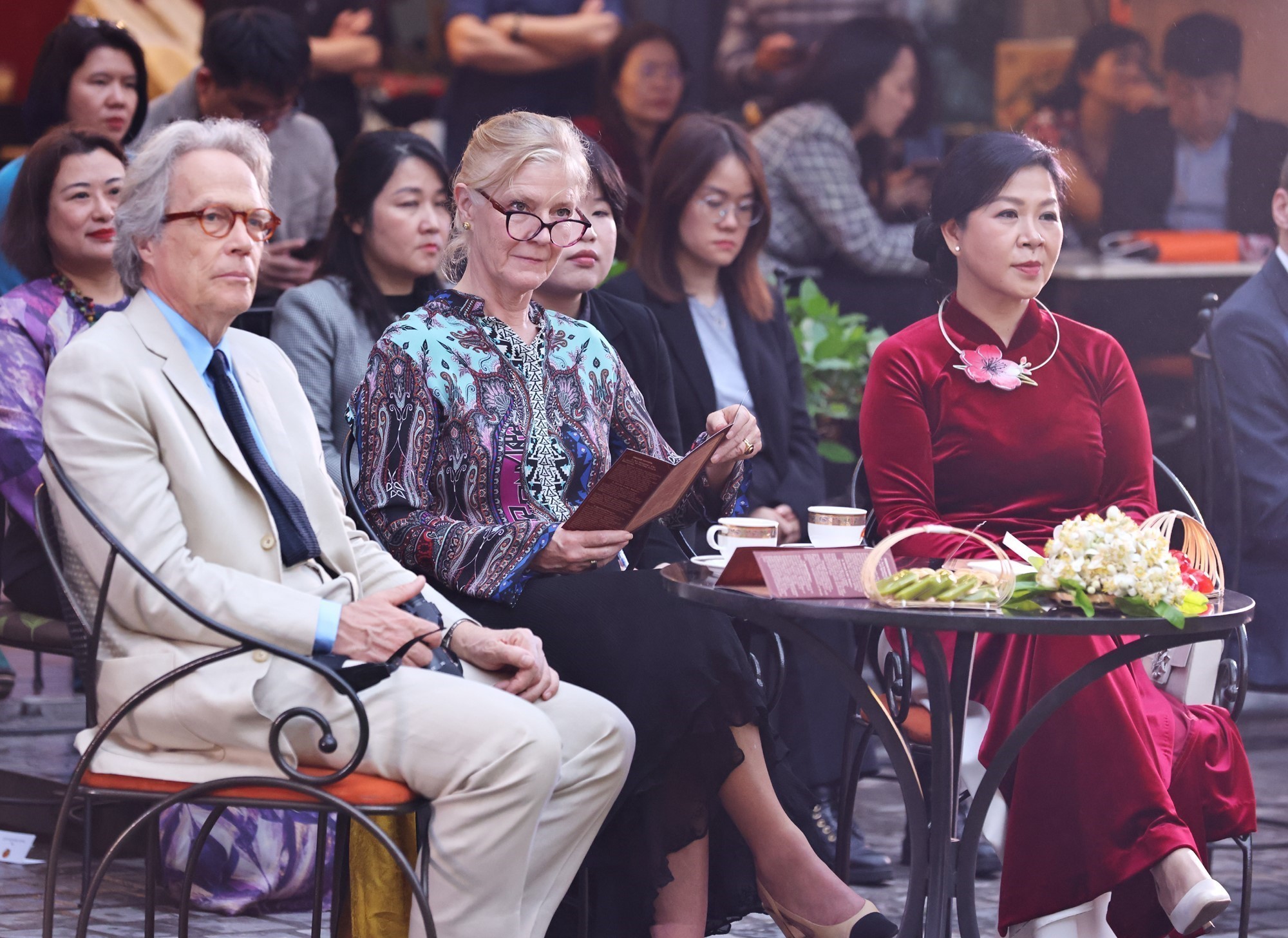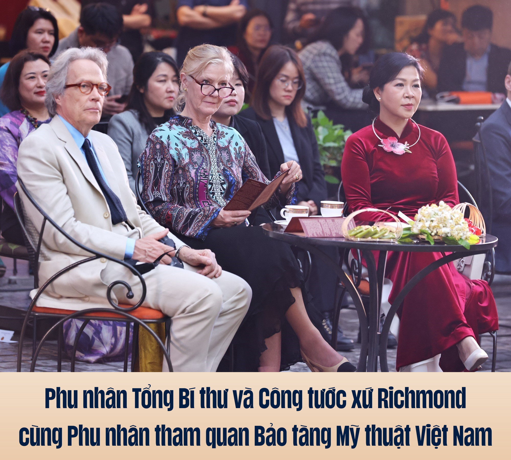 Phu nhân Ngô Phương Ly và ngài Charles Henry Gordon-Lennox, Công tước xứ Richmond cùng Phu nhân thưởng trà và xem các tiết mục đặc sắc tại sân trước Bảo tàng Mỹ thuật Việt Nam