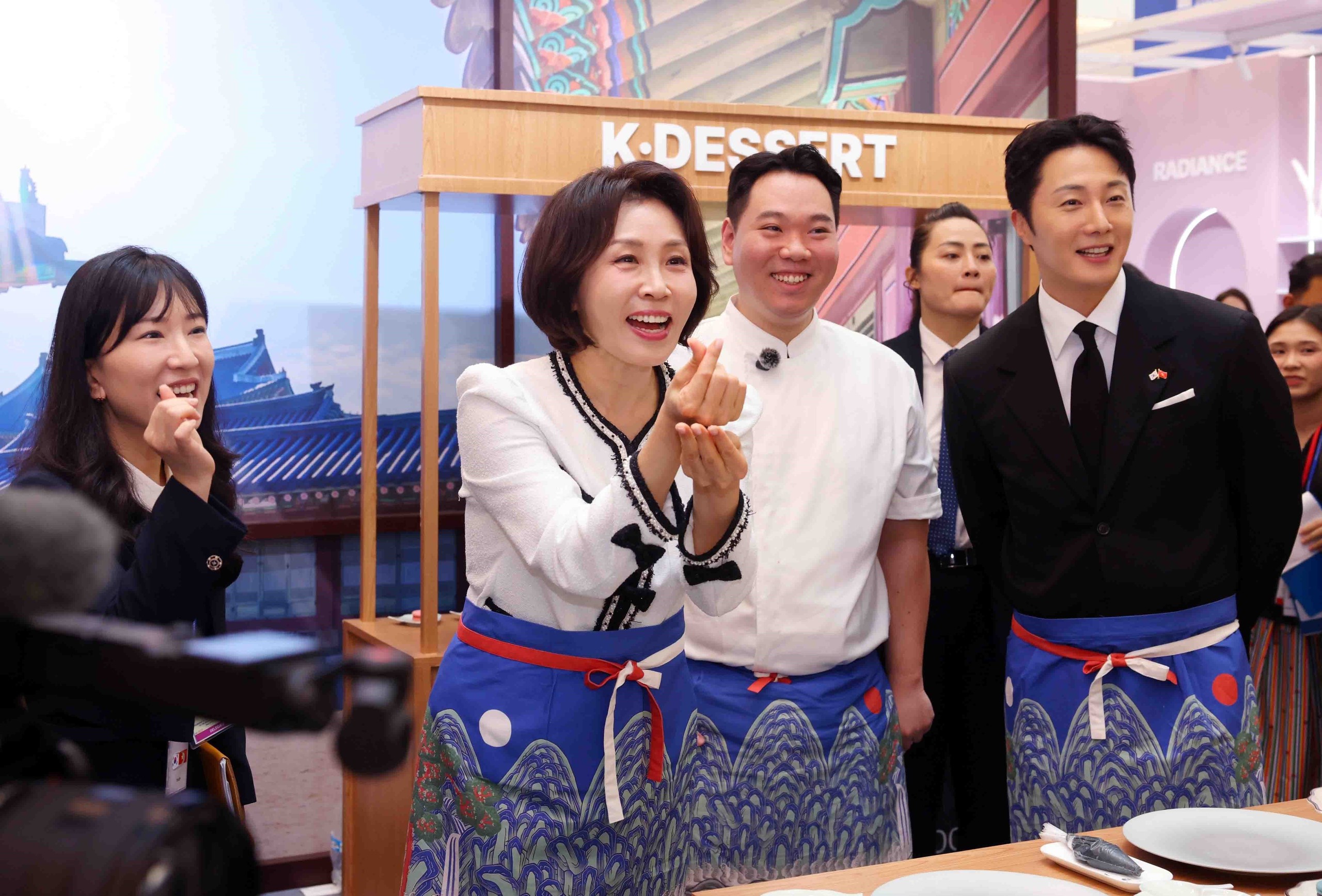 Phu nhân Tổng thống Hàn Quốc Lee Jae Myung, bà Kim Hae Kyung cùng các đại biểu trải nghiệm làm bánh tại Lễ hội Văn hóa và Du lịch Hàn Quốc 2026 được tổ chức tại Hà Nội. Ảnh: Phạm Kiên - TTXVN