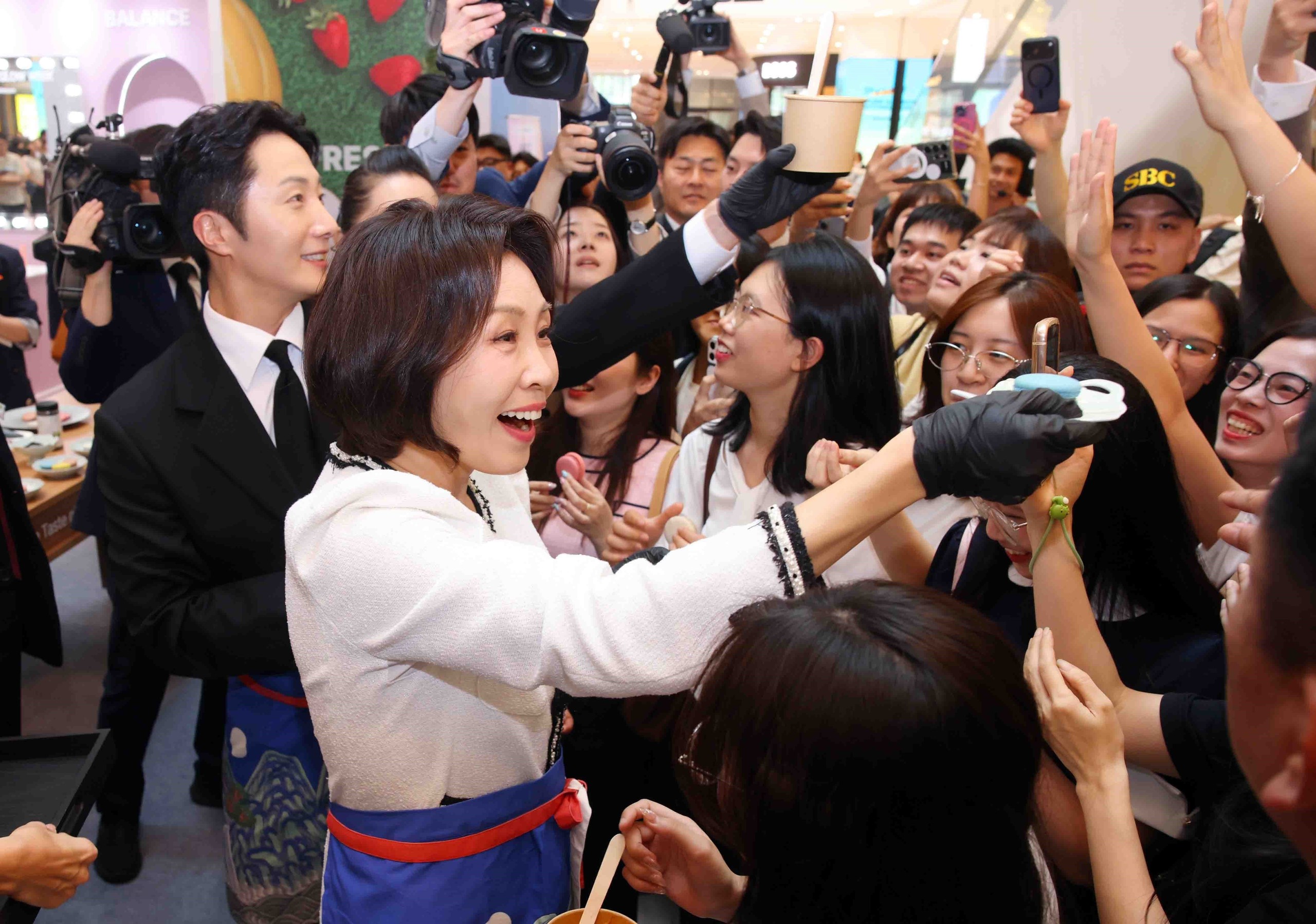 Phu nhân Tổng thống Hàn Quốc Lee Jae Myung, bà Kim Hae Kyung tặng những chiếc bánh vừa làm cho khách dự Lễ hội. Ảnh: Phạm Kiên - TTXVN