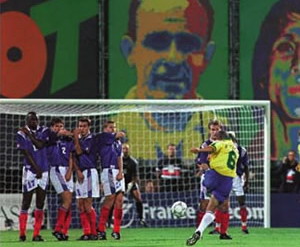 Trong trận đấu giữa Pháp và Brazil tại Cúp Tứ hùng năm 1997, đội khách đến từ Nam Mỹ có pha sút phạt ở cự ly 32 mét. Người nhận trách nhiệm đã phạt quen thuộc vẫn là Carlos và anh thực hiện bước chạy đà khoảng 10 mét. Cú nã đại bác sau đó là bàn thắng kinh điển đi vào lịch sử của bóng đá thế giới. Trái banh đi lượn vòng cung qua sát hàng rào và ghim thẳng vào góc xa khung thành Pháp. Nhiều người cho rằng cú sút ấy chỉ là 1 may mắn nhưng sau khi nghiên cứu kỹ lưỡng, khoa học lại không nghĩ như vậy. Cú sút đi vào lịch sử của Carlos - Ảnh: Internet |
