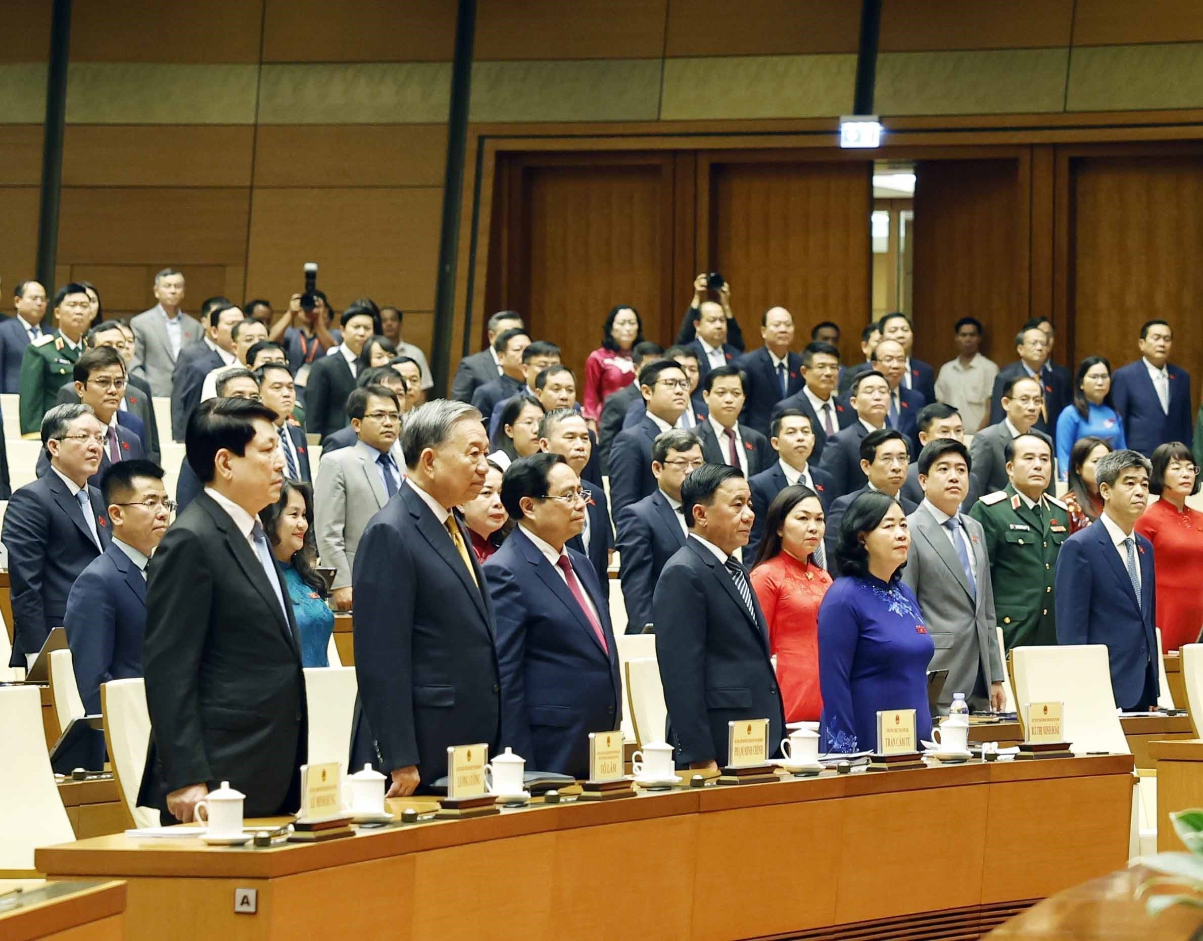 Dưới cờ đỏ sao vàng thiêng liêng của Tổ quốc, trước Quốc hội và đồng bào, cử tri cả nước, Thủ tướng Chính phủ Lê Minh Hưng tuyên thệ: “Tuyệt đối trung thành với Tổ quốc, với nhân dân, với Hiến pháp nước Cộng hòa xã hội chủ nghĩa Việt Nam, nỗ lực phấn đấu hoàn thành tốt nhiệm vụ được Đảng, Nhà nước, nhân dân giao phó".