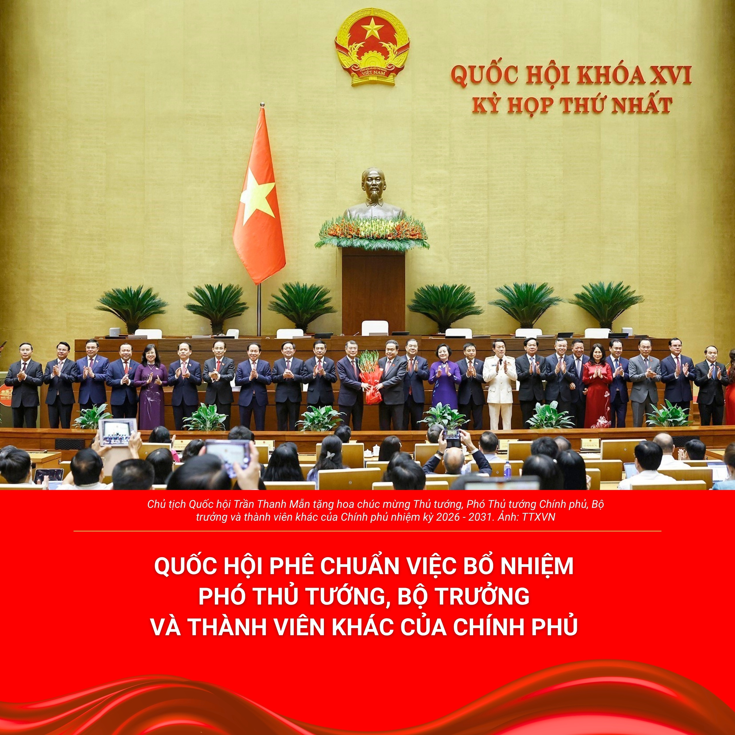 Chủ tịch Quốc hội Trần Thanh Mẫn tặng hoa chúc mừng Thủ tướng, Phó Thủ tướng Chính phủ, Bộ trưởng và thành viên khác của Chính phủ nhiệm kỳ 2026 - 2031. Ảnh: Doãn Tấn - TTXVN