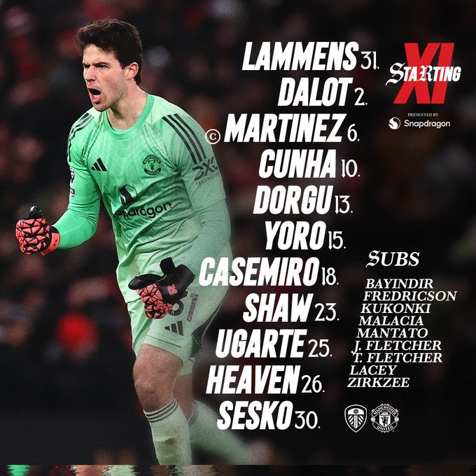 MU: Lammens; Shaw, Martinez, Heaven, Dalot; Casemiro, Ugarte; Dorgu, Cunha, Zirkzee; Sesko