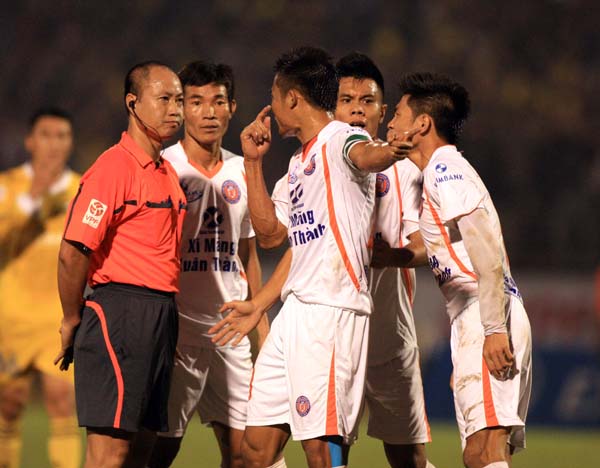 Nếu như trọng tài Nguyễn Trọng Thư bị phàn nàn khi rút hai thẻ đỏ vào cuối trận ĐT.LA- Đồng Nai, trọng tài Nguyễn Quốc Hùng chịu phản ứng vì không công nhận bàn thắng của Gaston Merlo cho SHB Đà Nẵng khi cho rằng bóng đã đi hết đường biên ngang thì ở sân Vinh, cầu thủ, BHL XMXT.SG phản ứng dữ dội quyết định thổi phạt 11m của trọng tài Hoàng Anh Tuấn.