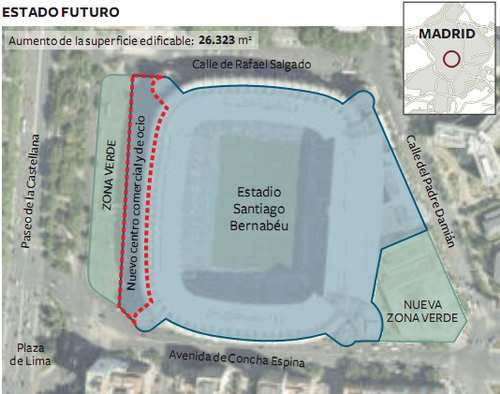 Như vậy, diện tích đất mới đó sẽ gắn liền với mặt trước của sân vận động. Do đó, câu lạc bộ sẽ không thể bán từng phần khu đất đó đi được và chỉ có thể sử dụng với mục đích thứ ba. Nói cách khác, khu đất đó sẽ dành cho trung tâm thương mại, khách sạn, khu văn phòng... chứ không dành để xây nhà ở được. Hơn nữa, câu lạc bộ Real Madrid còn được phép xây dựng và khai thác một bãi đỗ xe với sức chứa 600 chỗ ở dưới khu đất này.