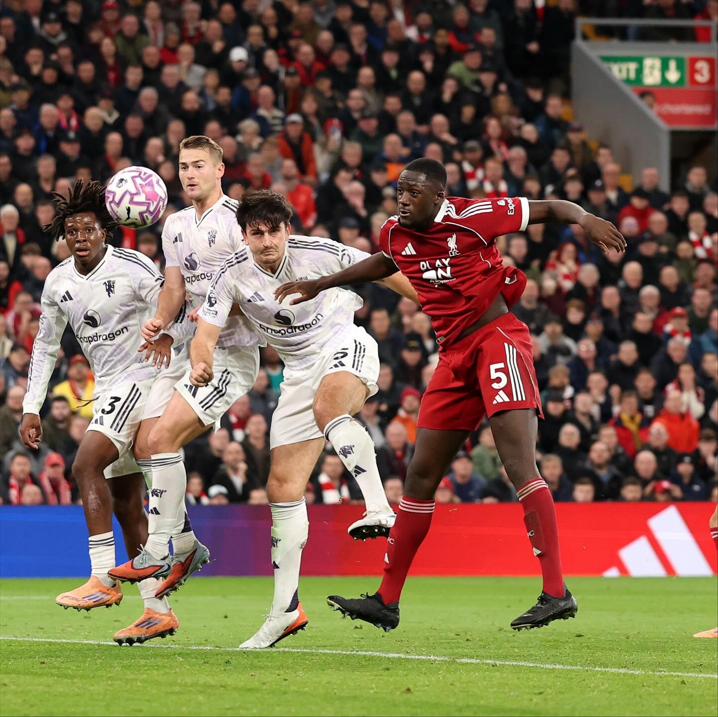 Trận đấu mở màn theo cách đầy tranh cãi. Ngay phút đầu tiên, Mbeumo va chạm trên không với Mac Allister và Van Dijk, khiến Mac Allister nằm sân ôm đầu. Trong khi Liverpool đòi dừng trận vì chấn thương, trọng tài vẫn cho tiếp tục và Amad Diallo chọc khe để Mbeumo ghi bàn.