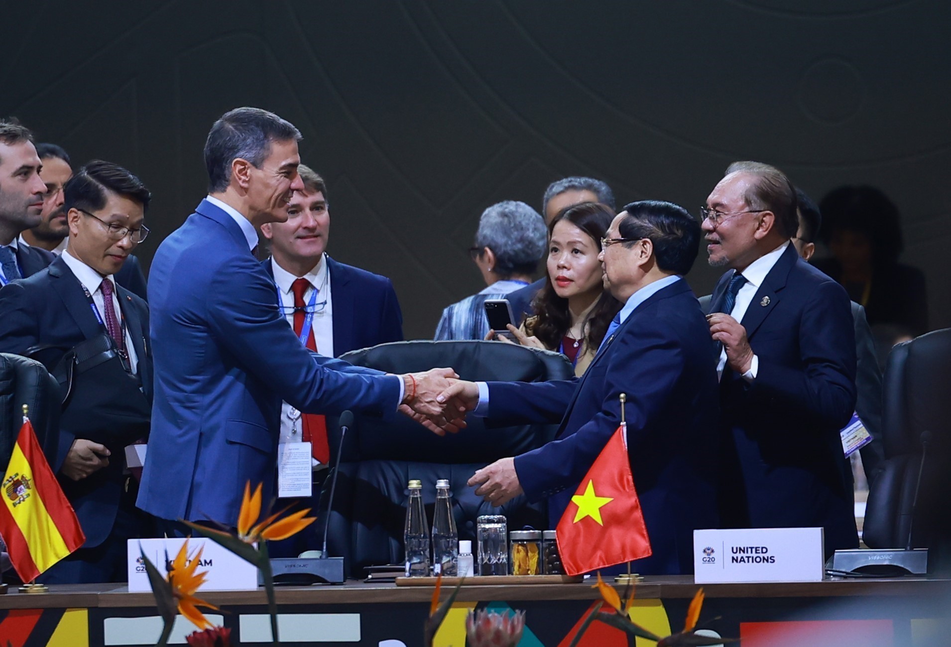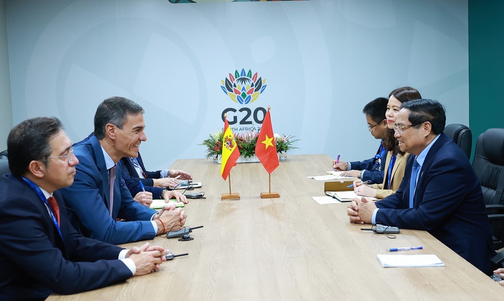 Nhân dịp tham dự Hội nghị Thượng đỉnh G20 tại Nam Phi, ngày 22/11, Thủ tướng Chính phủ Phạm Minh Chính đã gặp Thủ tướng Tây Ban Nha Pedro Sánchez.