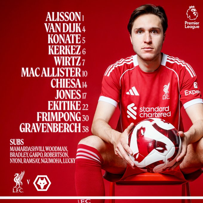 Liverpool: Alisson; Bradley, Konate, Van Dijk, Kerkez; Jones, Gravenberch; Gakpo, Mac Allister, Wirtz; Ekitike