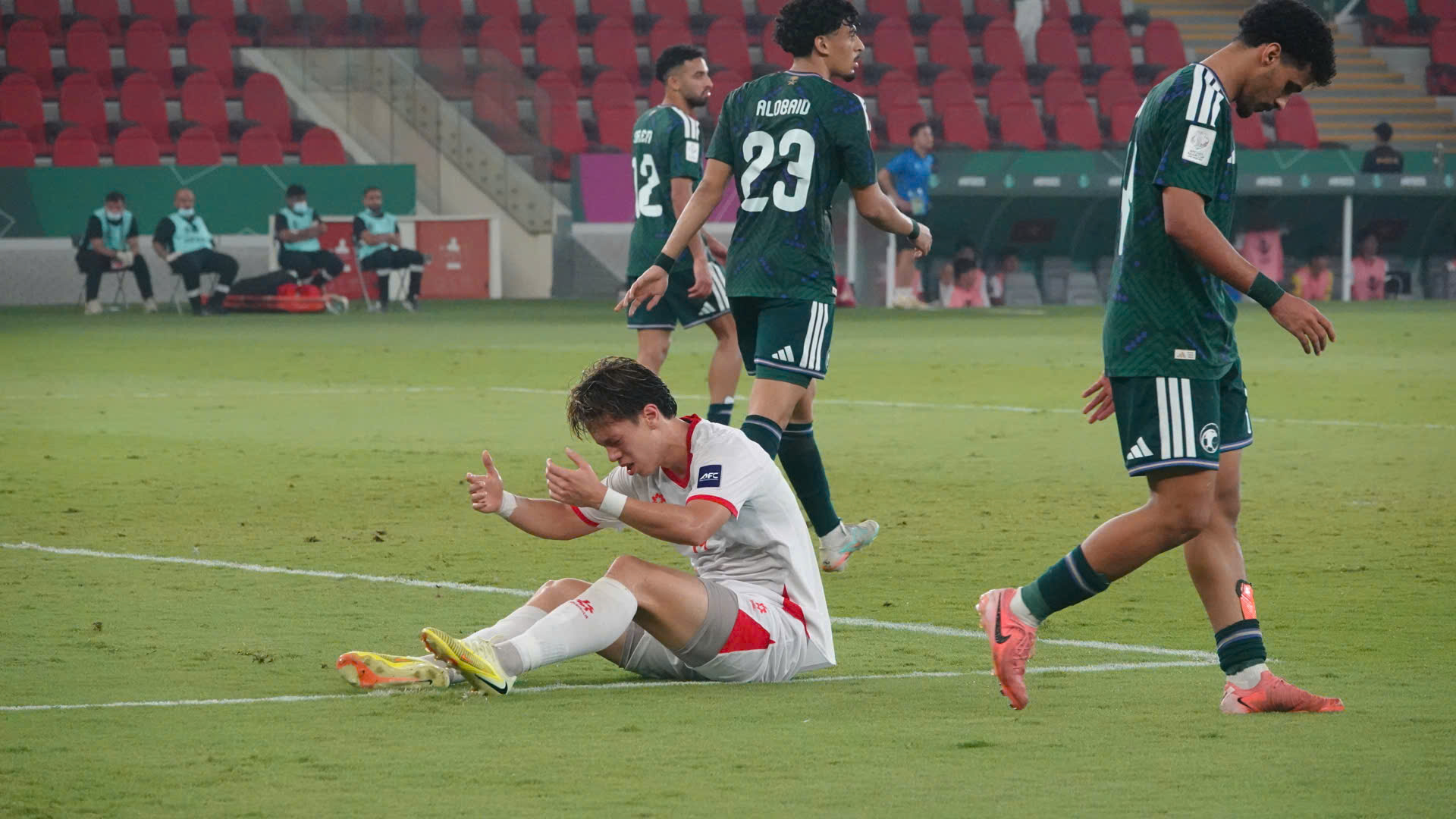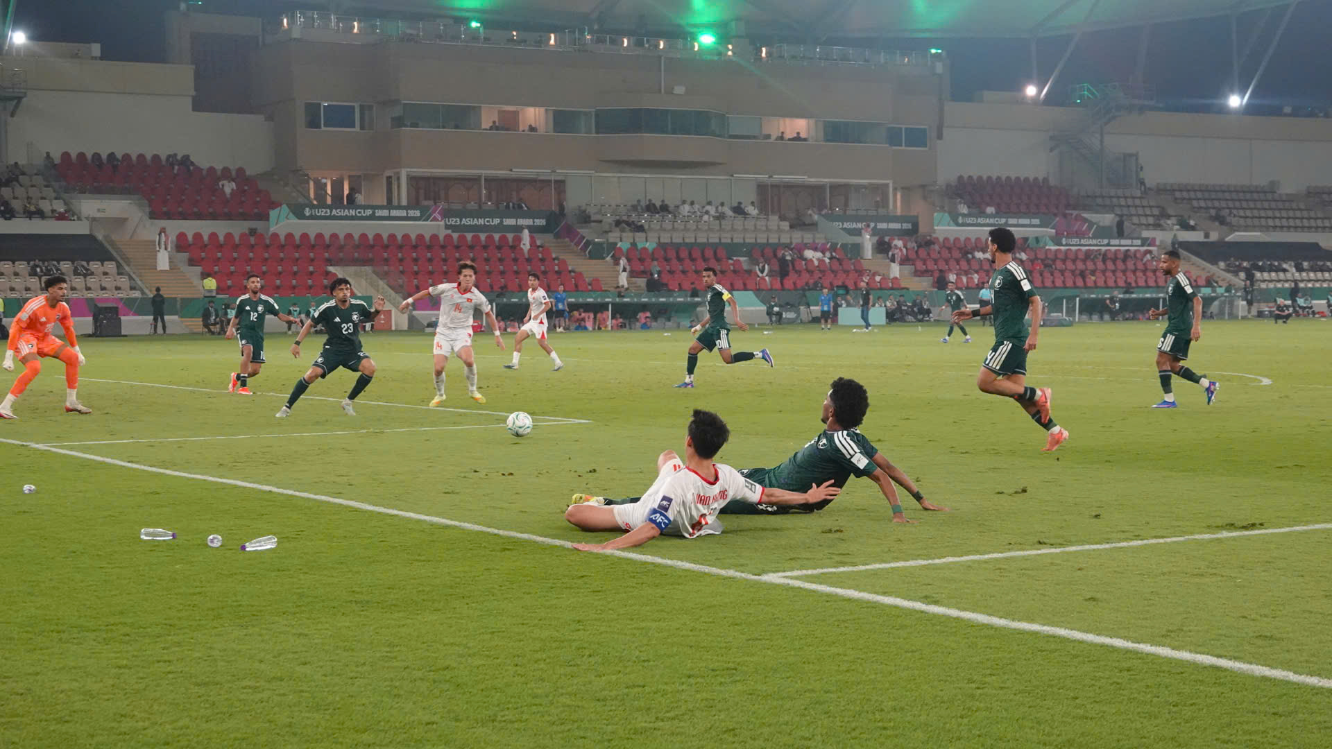87': KHÔNG VÀO! Thamer Al Khaibri của U23 Saudi Arabia đánh đầu trong vòng cấm nhưng bóng đi ra ngoài.