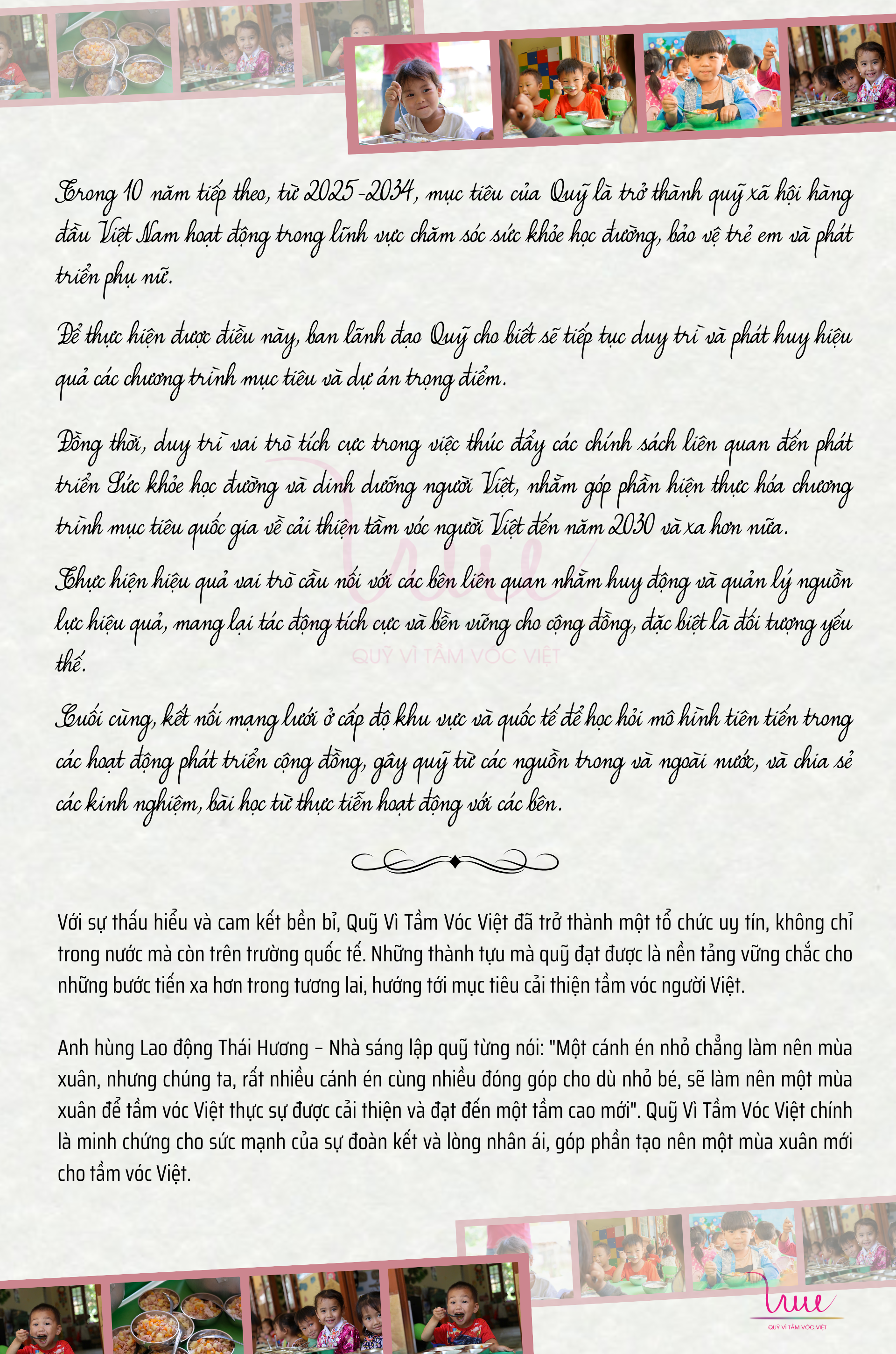 Trong suốt 10 năm qua, kiên trì với sứ mệnh “Vì tầm vóc Việt”, hàng loạt chương trình thiết thực do Quỹ triển khai đã góp phần hiện thực hóa từng bước khát vọng nâng cao tầm vóc, thể lực và trí lực người Việt, trong đó ưu tiên đầu tiên là trẻ em lứa tuổi học đường - lứa tuổi vàng để phát triển tầm vóc, thể lực.