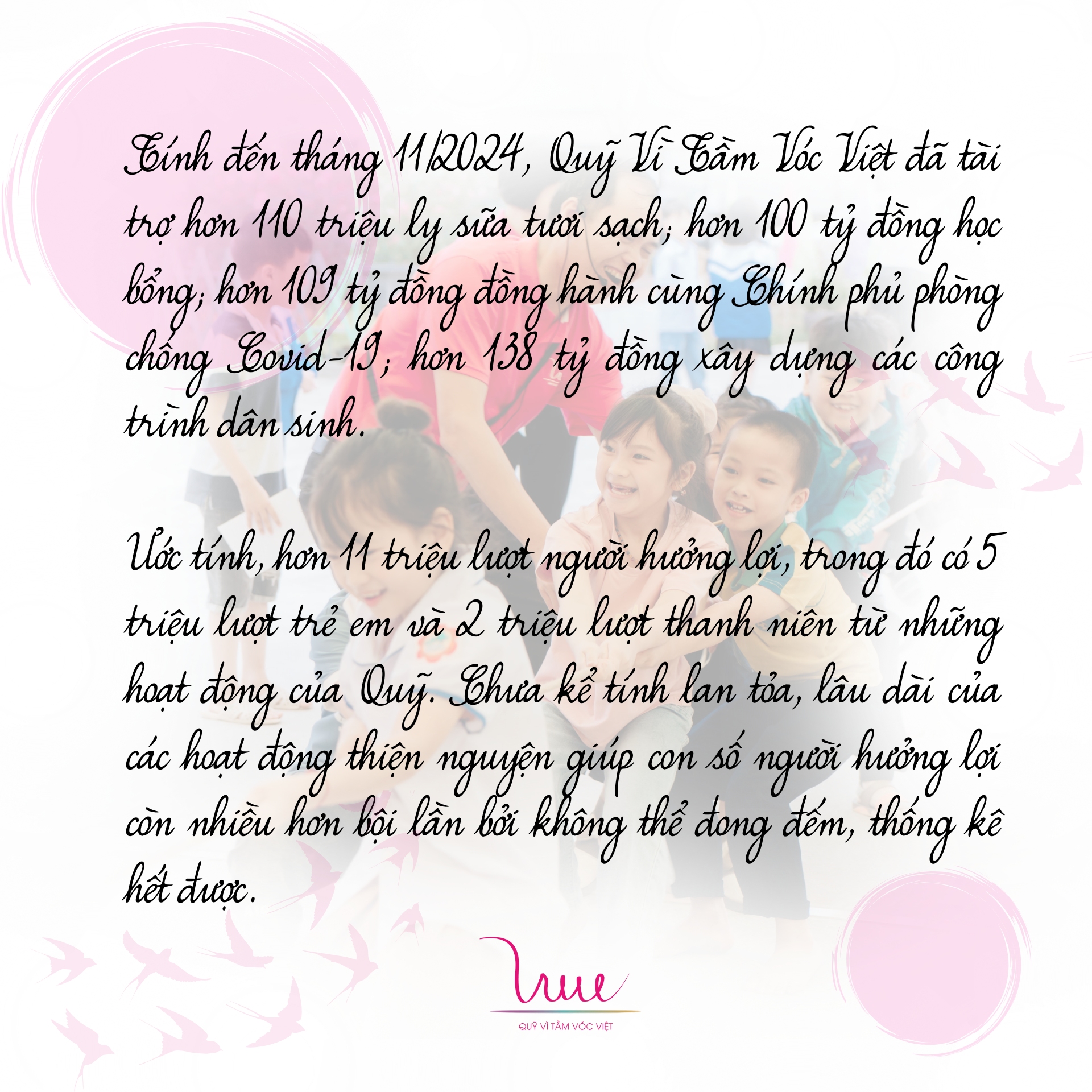 Quỹ và Tập đoàn TH đã đóng góp hàng trăm tỷ đồng để trẻ em được uống sữa, không kể giàu nghèo. Trong 10 năm qua kể từ khi Quỹ thành lập, đã có hơn 110 triệu ly sữa và 8 triệu bữa ăn được trao tặng cho trẻ em có hoàn cảnh khó khăn.