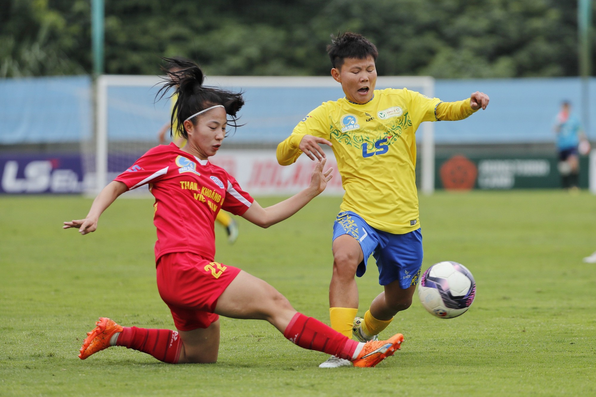 Bích Thuỳ (vàng) giúp CLB TP.HCM 1 hoà Than khoáng sản Việt Nam chiều 19/12. Ảnh: TSB