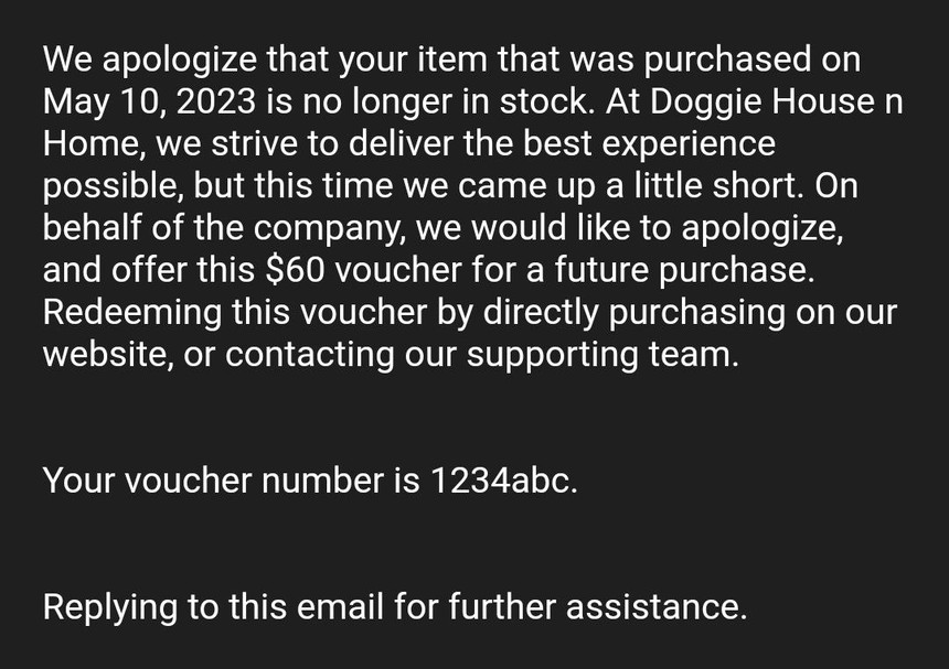 Chúng tôi xin lỗi, rằng vật phẩm bạn mua vào ngày 10/5/2023 không còn hàng. Tại Doggie House n Home, chúng tôi đặt mục tiêu cung cấp trải nghiệm tốt nhất có thể, nhưng lần này đã không làm được rồi. Thay mặt công ty, chúng tôi mong muốn xin lỗi, và bồi thường voucher trị giá 60 USD cho lần mua hàng tới của bạn. Áp dụng voucher bằng cách trực tiếp mua hàng trên website của chúng tôi, hoặc liên hệ với đội ngũ hỗ trợ.