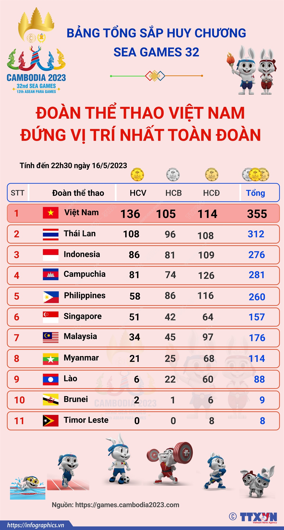 Lần đầu tiên và duy nhất tới lúc này chúng ta đứng đầu BXH khi không phải chủ nhà là tại SEA Games 32 ở Campuchia vào năm 2023 với 136 HCV, bỏ xa đoàn về nhì là Thái Lan (108) cũng như đoàn xếp thứ 3 là Indonesia (87). Sự kiện này đã khiến giới truyền thông thể thao khu vực rất chú ý, vì nó mang ý nghĩa của 1 dấu ấn trong tiến trình phát triển của thể thao nước nhà.
