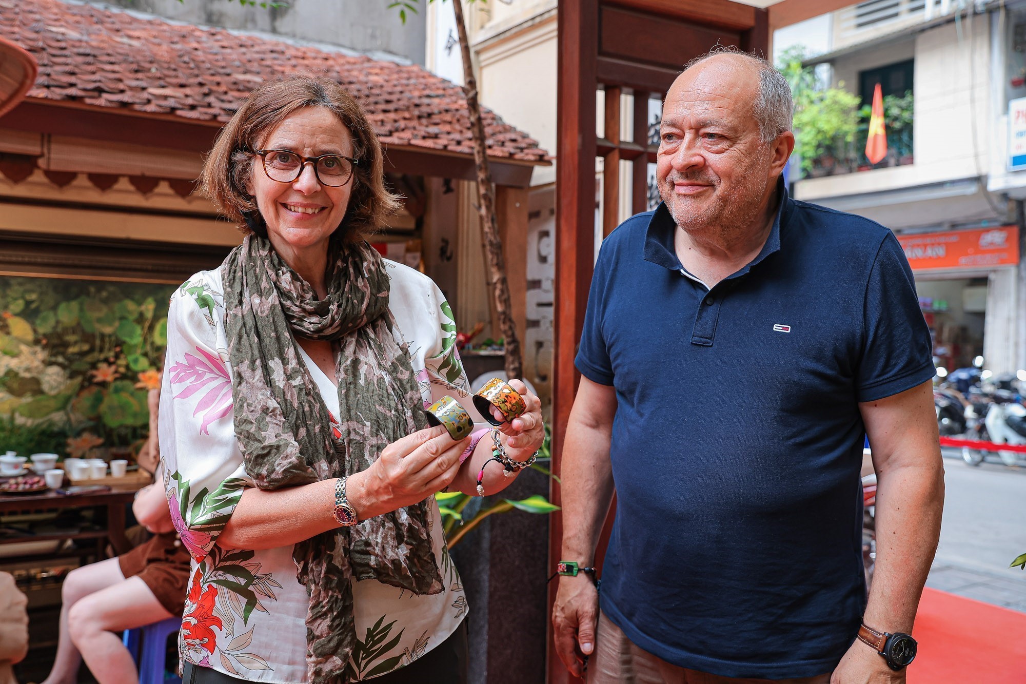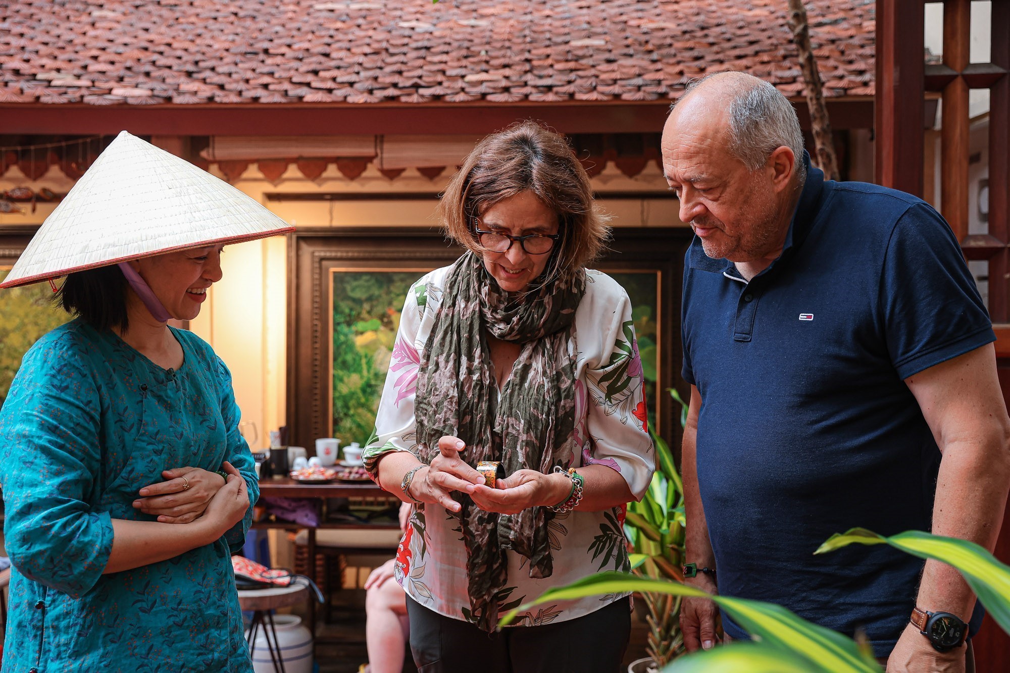 Du khách nước ngoài tìm hiểu và trải nghiệm sản phẩm sơn ta, thể hiện sức hút của văn hóa truyền thống Việt Nam