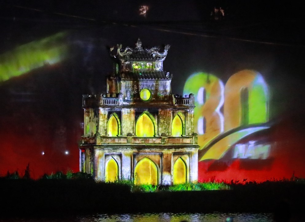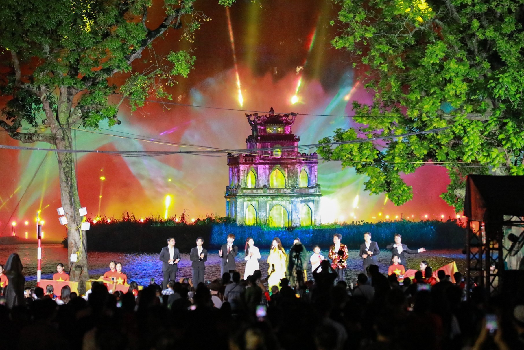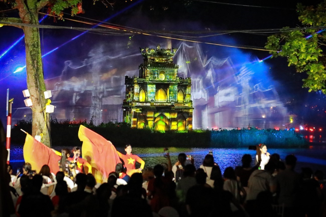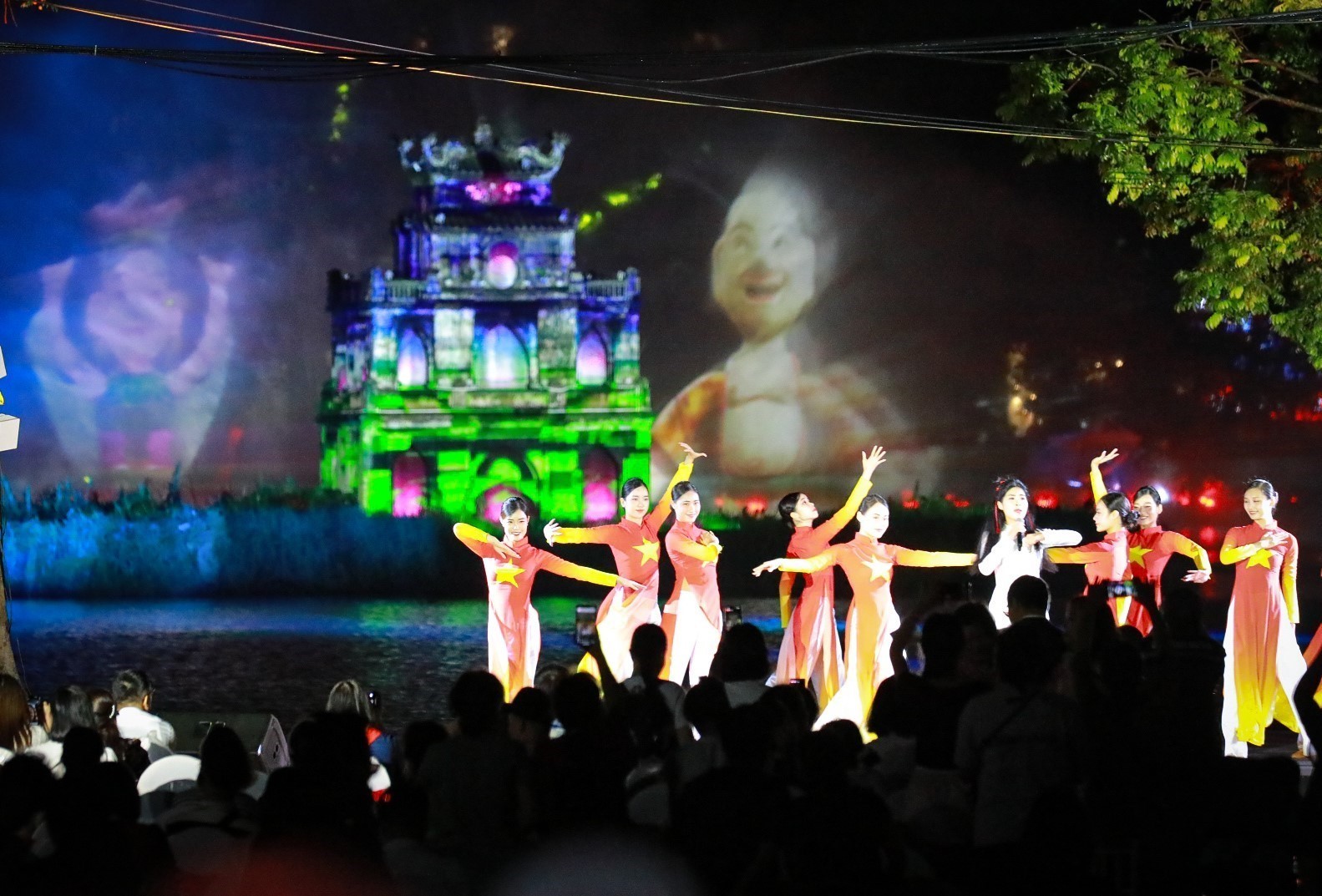 Trình diễn ánh sáng 3D Mapping trên Tháp Rùa kết hợp hệ thống màn nước độc đáo trong chương trình “Hà Nội rạng rỡ”. Ảnh: TTXVN