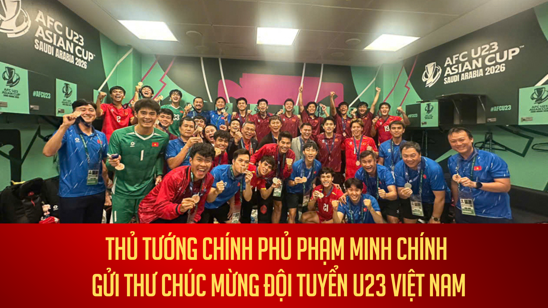 Rạng sáng ngày 24/1/2026, ngay sau chiến thắng tuyệt vời của Đội tuyển bóng đá nam U23 Việt Nam giành Huy chương Đồng tại Giải bóng đá U23 châu Á 2026, Thủ tướng Chính phủ Phạm Minh Chính đã gửi thư chúc mừng Ban huấn luyện và toàn thể Đội tuyển bóng đá nam U23 quốc gia Việt Nam.