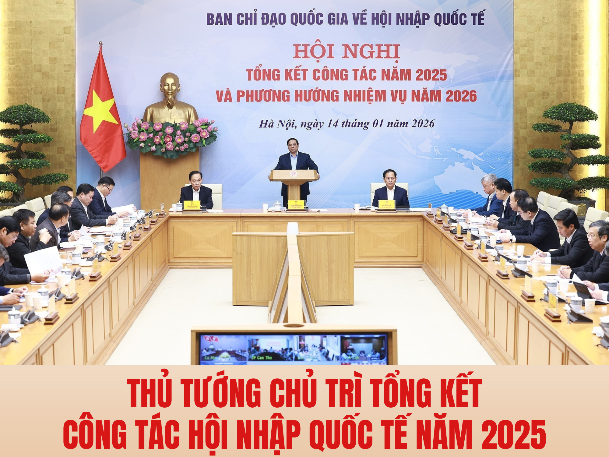 Sáng 14/1/2026, tại Hà Nội, Thủ tướng Phạm Minh Chính, Trưởng Ban Chỉ đạo Quốc gia về hội nhập quốc tế chủ trì Hội nghị tổng kết công tác năm 2025 và phương hướng, nhiệm vụ năm 2026 của Ban Chỉ đạo.