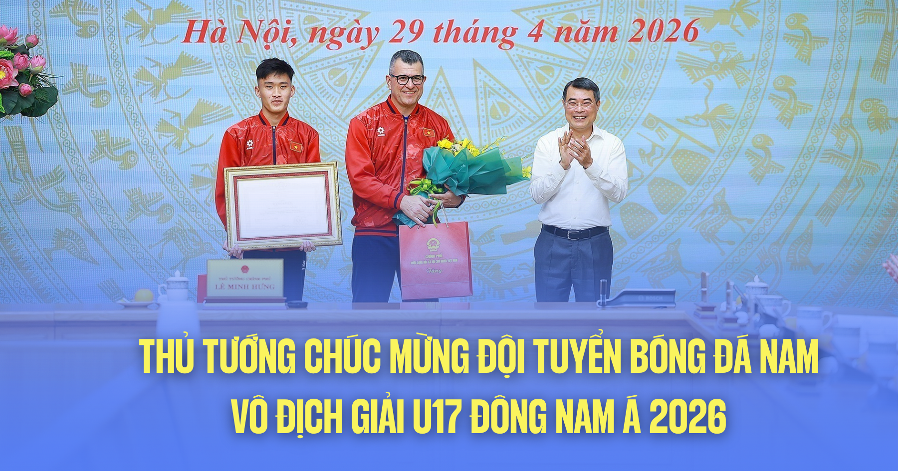 Chiều 29/4/2026, tại Trụ sở Chính phủ, Thủ tướng Lê Minh Hưng gặp mặt chúc mừng, biểu dương đội tuyển bóng đá nam U17 Quốc gia Việt Nam đã xuất sắc giành chức vô địch giải U17 Đông Nam Á 2026 tại Indonesia và chuẩn bị lên đường tham dự vòng chung kết U17 châu Á 2026 sẽ diễn ra tại Saudi Arabia từ ngày 5-23/5.