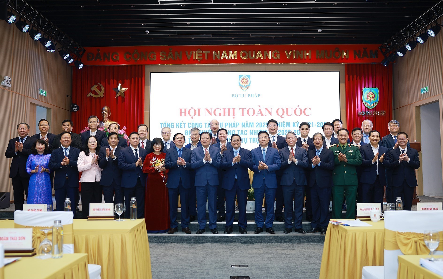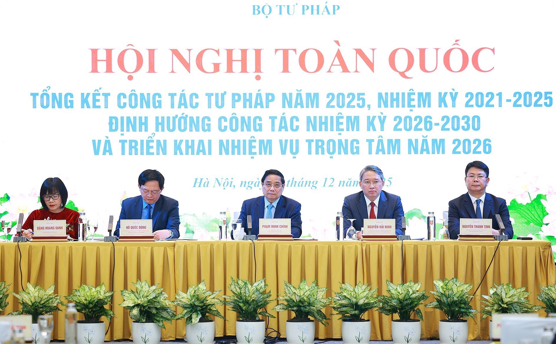Thủ tướng Phạm Minh Chính và Phó Thủ tướng Hồ Quốc Dũng cùng lãnh đạo Bộ Tư pháp chủ trì Hội nghị toàn quốc tổng kết công tác Tư pháp năm 2025. Ảnh: Dương Giang-TTXVN