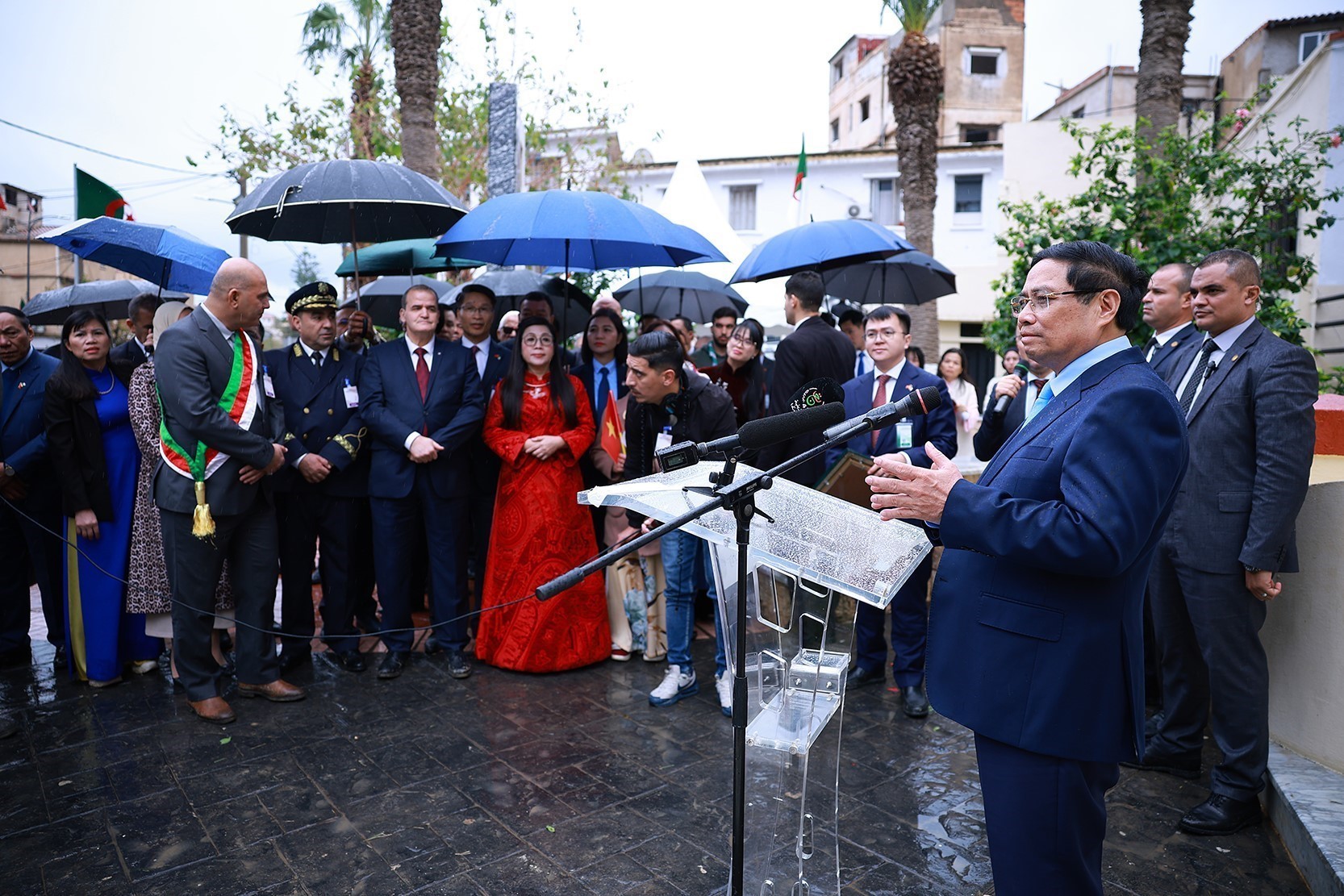 Thủ tướng Phạm Minh Chính phát biểu tại Lễ khánh thành Bia tưởng niệm Chủ tịch Hồ Chí Minh tại thủ đô Alger, Algeria. Ảnh: Dương Giang-TTXVN