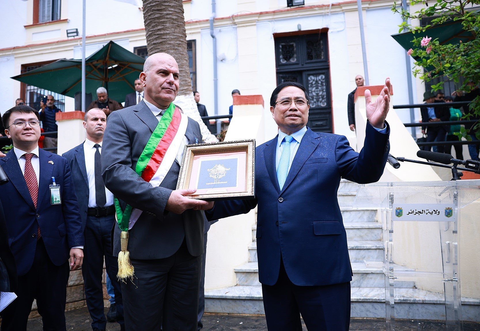Thủ tướng Phạm Minh Chính tặng quà cho chính quyền địa phương, nơi đặt bia tưởng niệm về thân thế, sự nghiệp Chủ tịch Hồ Chí Minh ở Algeria. Ảnh: Dương Giang- TTXVN