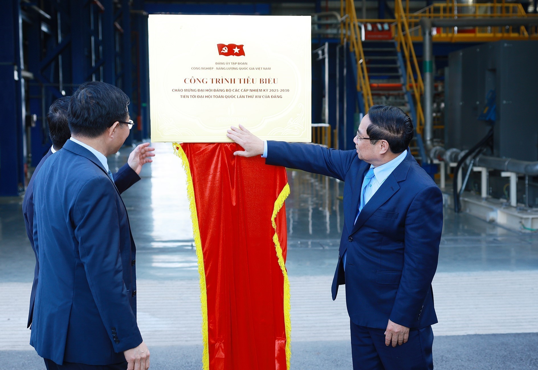 Thủ tướng Phạm Minh Chính và các đại biểu thực hiện nghi thức gắn biển Công trình chào mừng Đại hội XIV của Đảng
