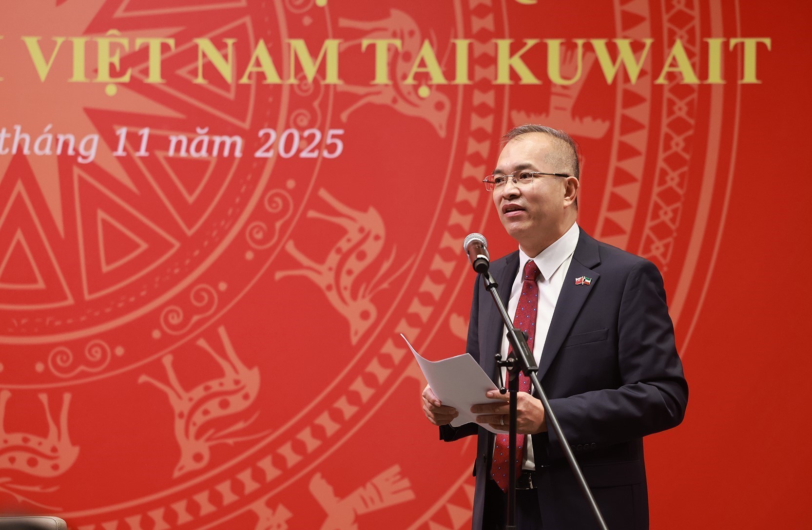 Đại sứ Việt Nam tại Kuwait Nguyễn Đức Thắng báo cáo tình hình cộng đồng người Việt Nam tại Kuwait. Ảnh: Dương Giang-TTXVN