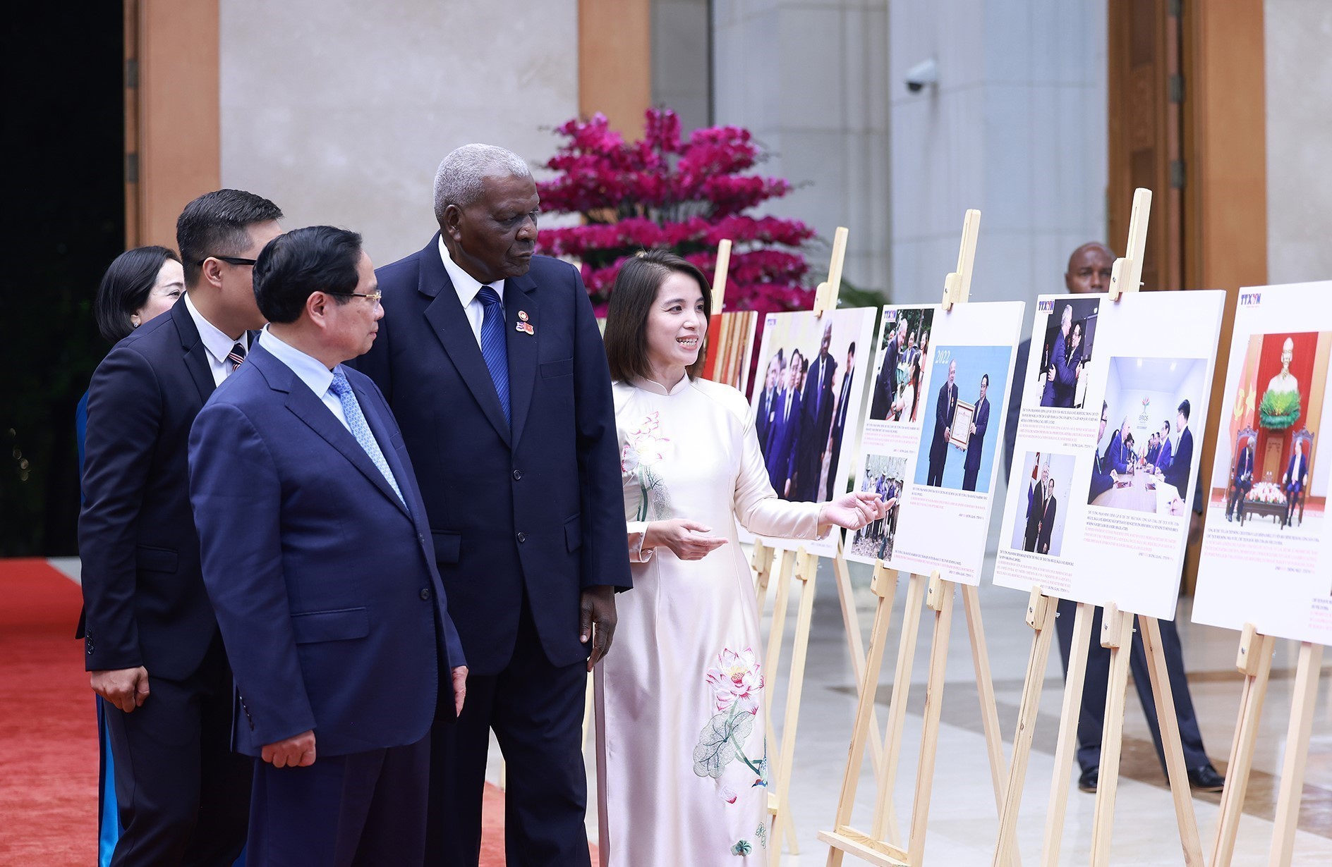 Thủ tướng Phạm Minh Chính và Chủ tịch Quốc hội Cuba Esteban Lazo Hernández tham quan trưng bày ảnh về quan hệ hợp tác giữa hai nước (do TTXVN thực hiện). Ảnh: Dương Giang-TTXVN