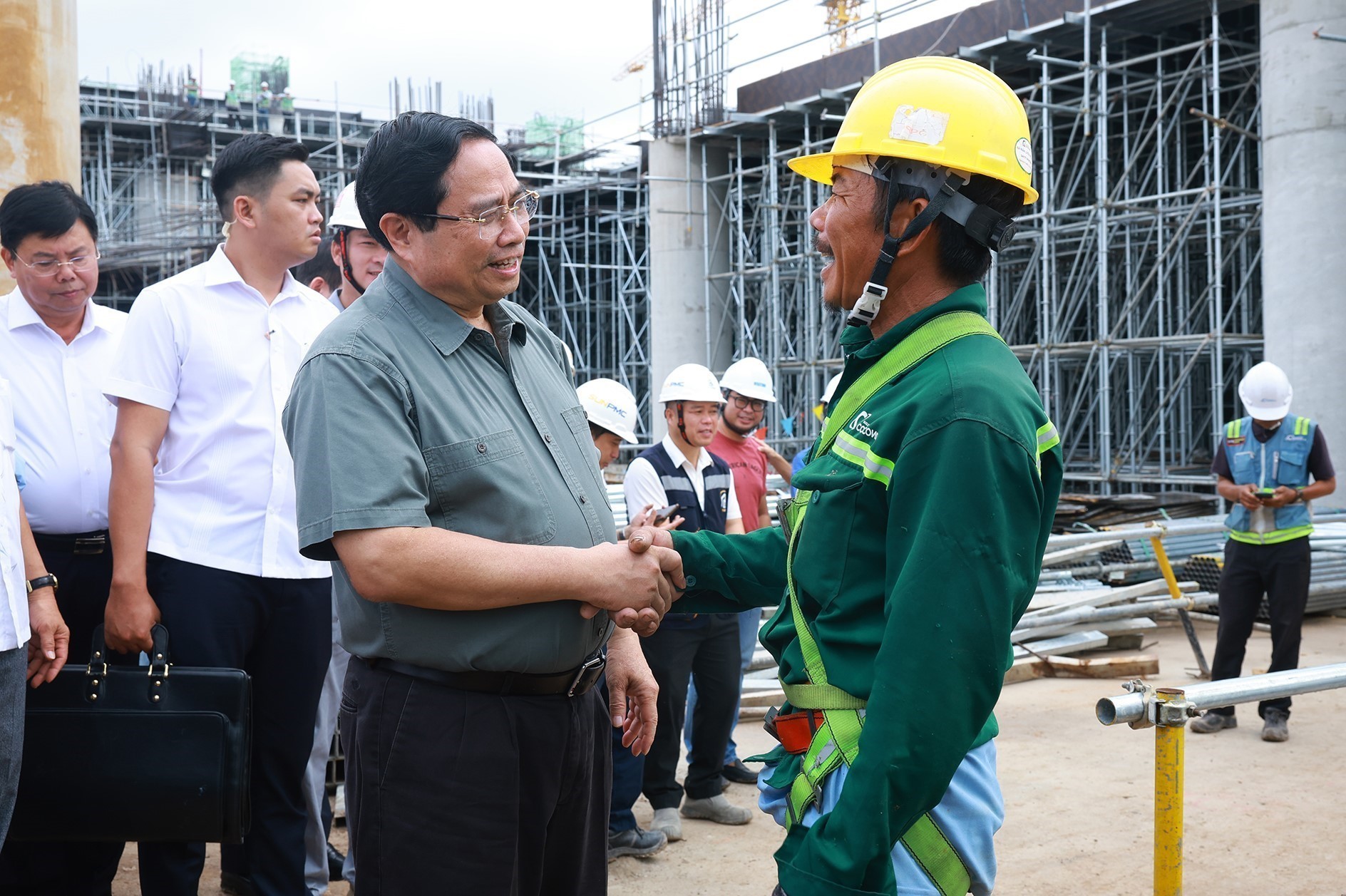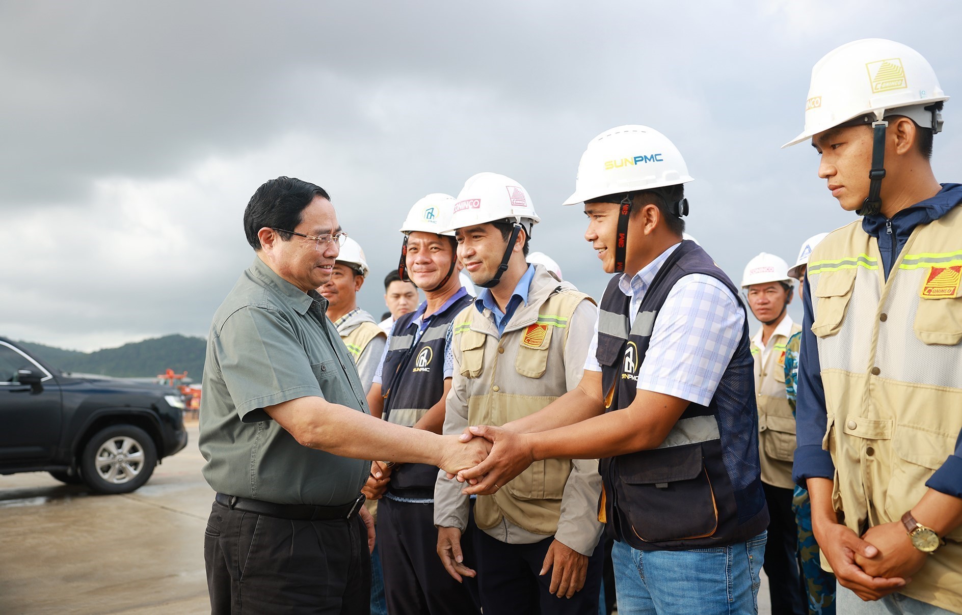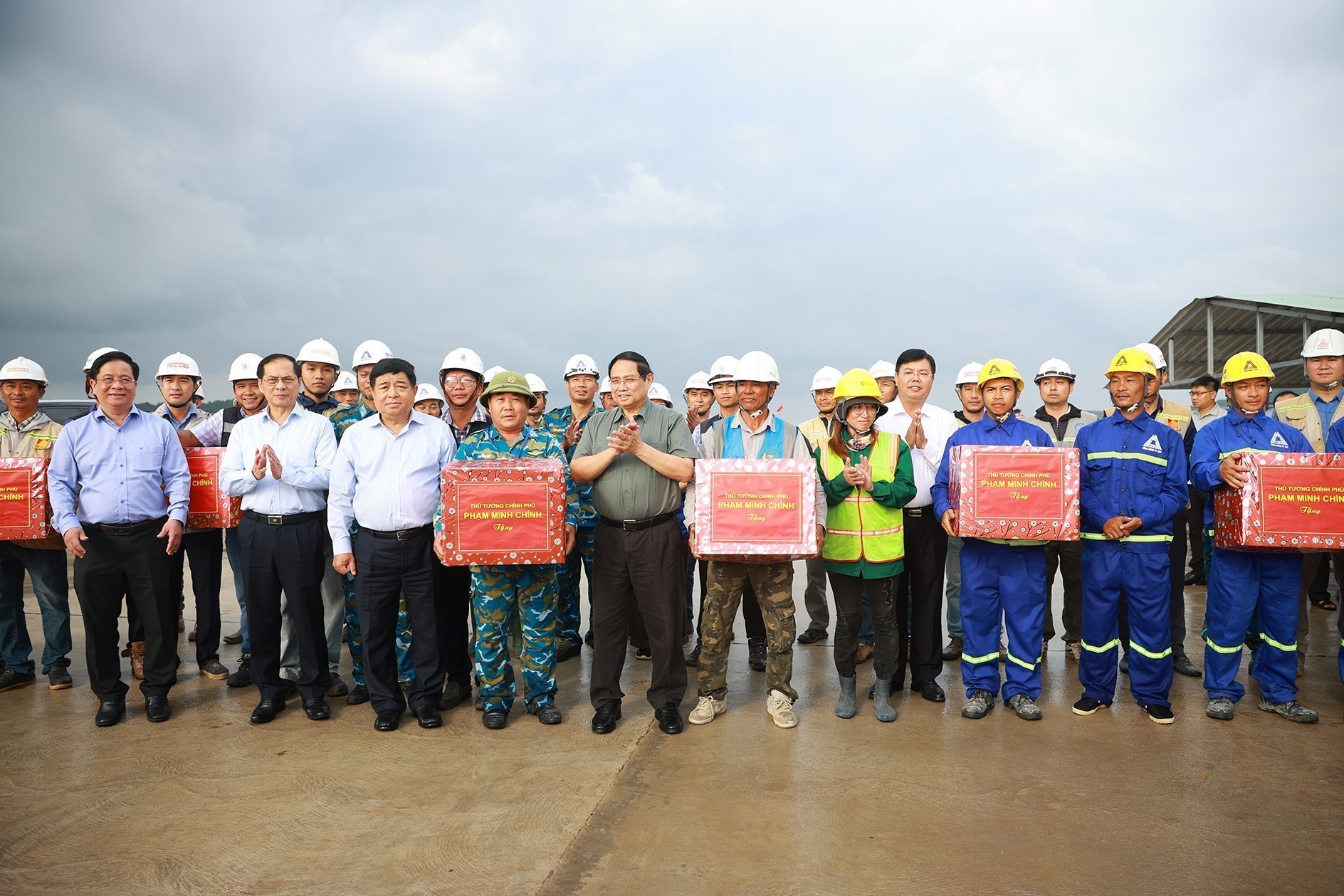 Thủ tướng Phạm Minh Chính với công nhân thi công dự án Cảng hàng không quốc tế Phú Quốc. Ảnh: Dương Giang-TTXVN
