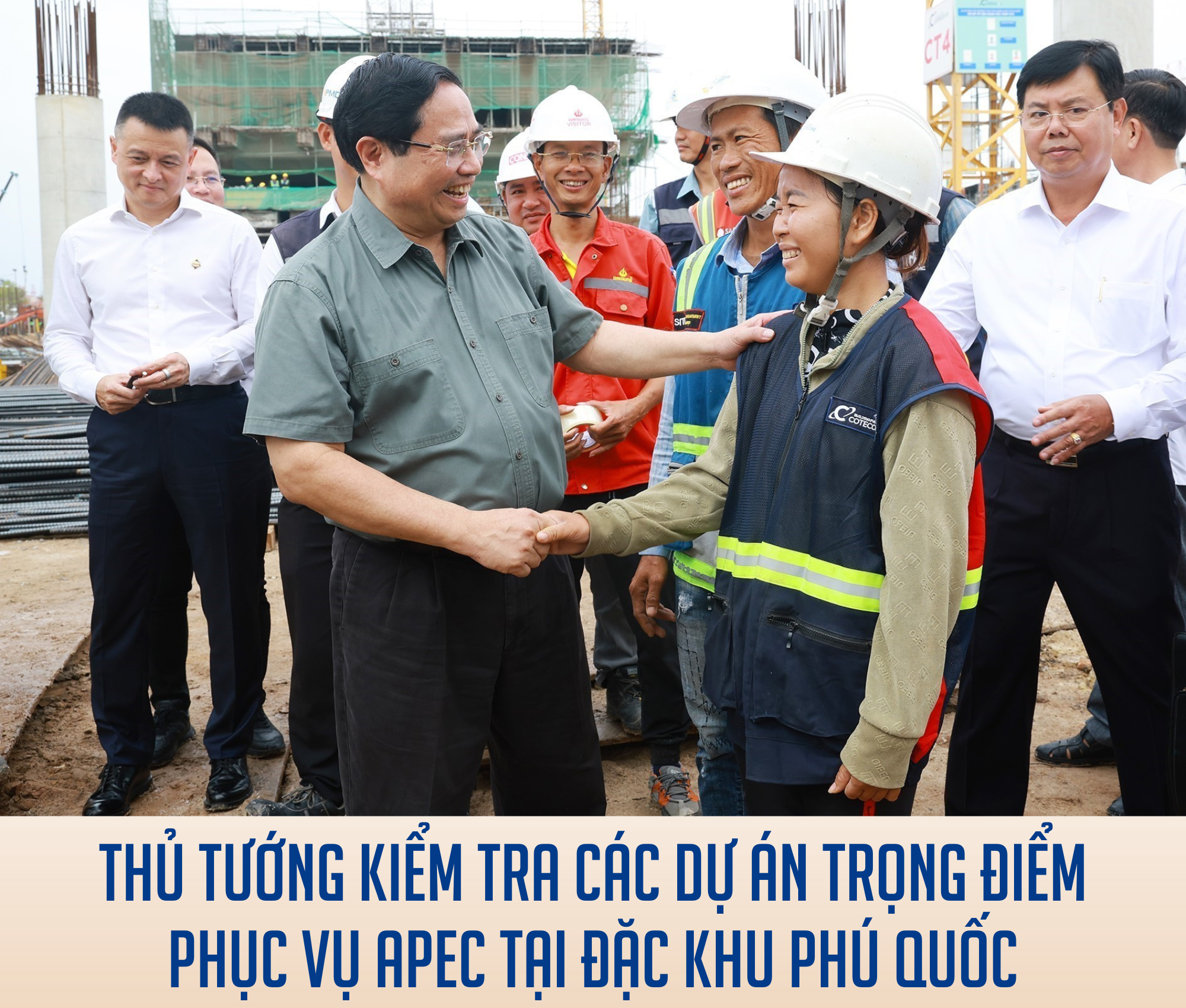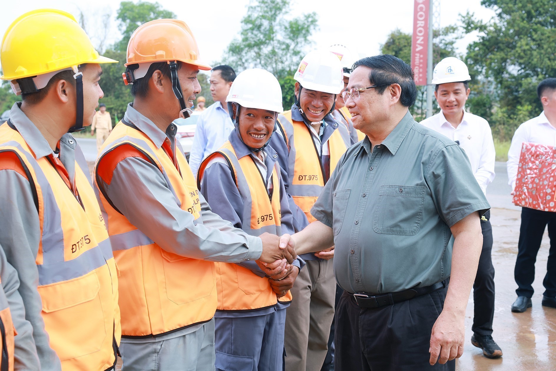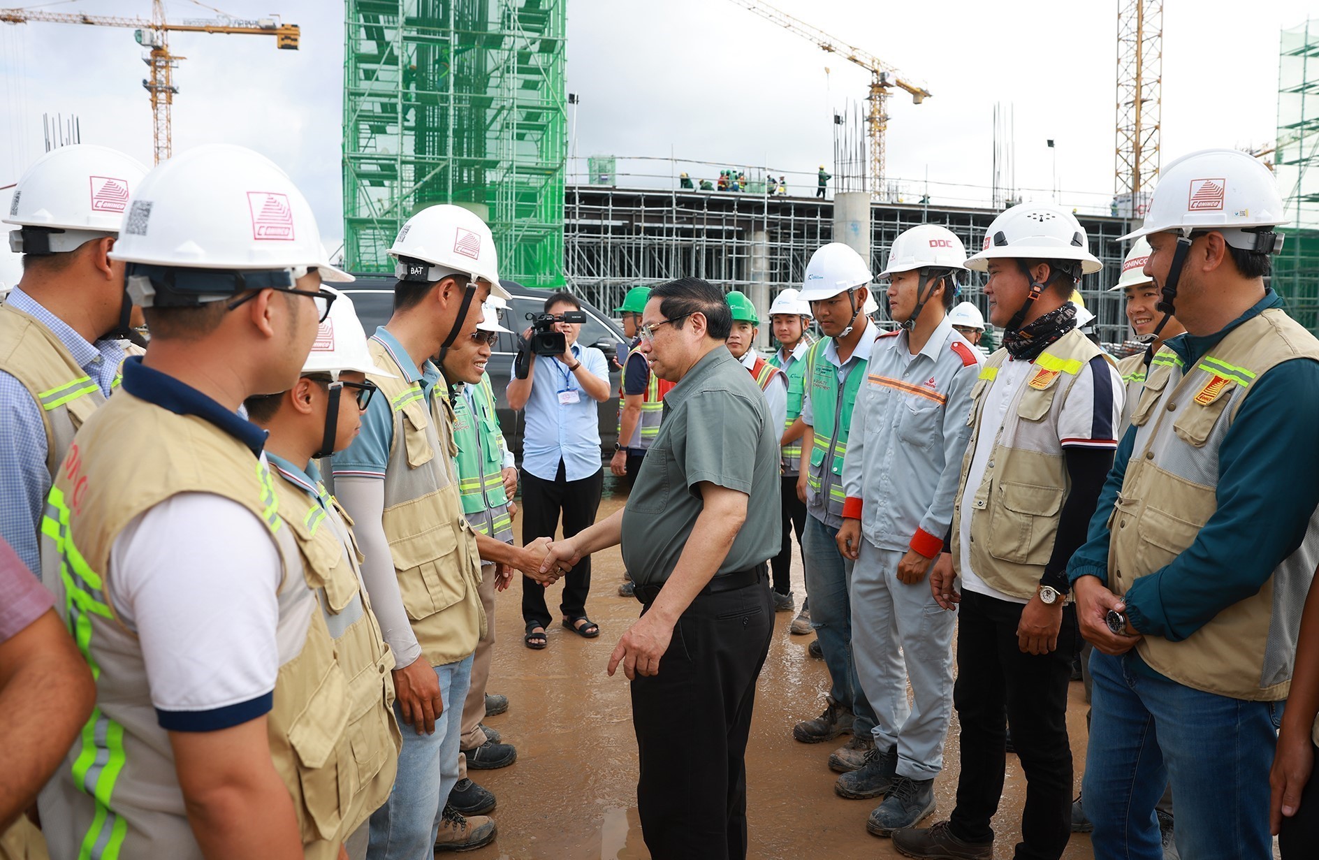 Thủ tướng Phạm Minh Chính với công nhân thi công dự án Cảng hàng không quốc tế Phú Quốc. Ảnh: Dương Giang-TTXVN